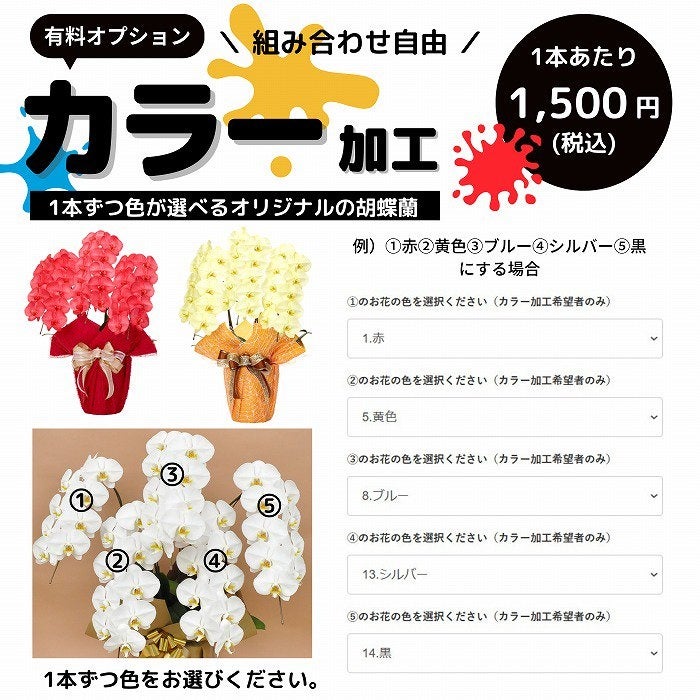 「カスタマイズ胡蝶蘭」は14色ある中で、1本づつ色を変えることが可能。