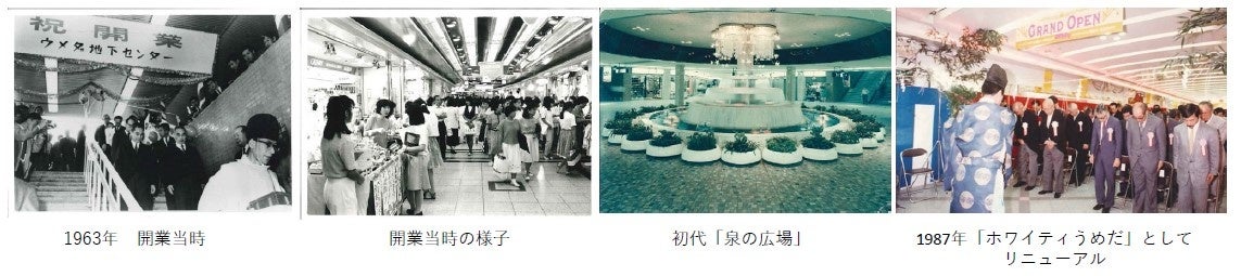 「ホワイティうめだ」は1963(昭和38)年11月29日、ウメダ地下センターとして創業しました。1970(昭和45)年には第2 期部分が完成し、その後の象徴となる「泉の広場」が誕生しました。1987年には「ホワイティうめだ」としてリニューアルし、梅田の街やお客様のニーズが変わっていく中で「mikke(ミッケ)」や「FARURU(ファルル)」「NOMOKA(ノモカ)」など、新たなゾーンを誕生させてきました。また、梅田の待ち合わせ場所として有名な「泉の広場」は、1970年の初代から3回のリニューアルを経て、2019年、現在のLED照明を用いて四季のうつろいを感じさせる「Water Tree 」へと変わり、新たなシンボルとなっています。