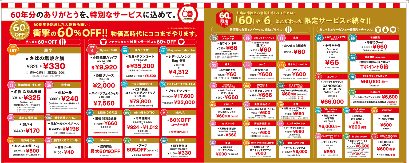 物価・価格高騰が叫ばれる中、Whity館内の各店舗が60周年をテーマに「60」や「6 」にちなんだ1日限りの大特価メニューや特別サービスを提供します。