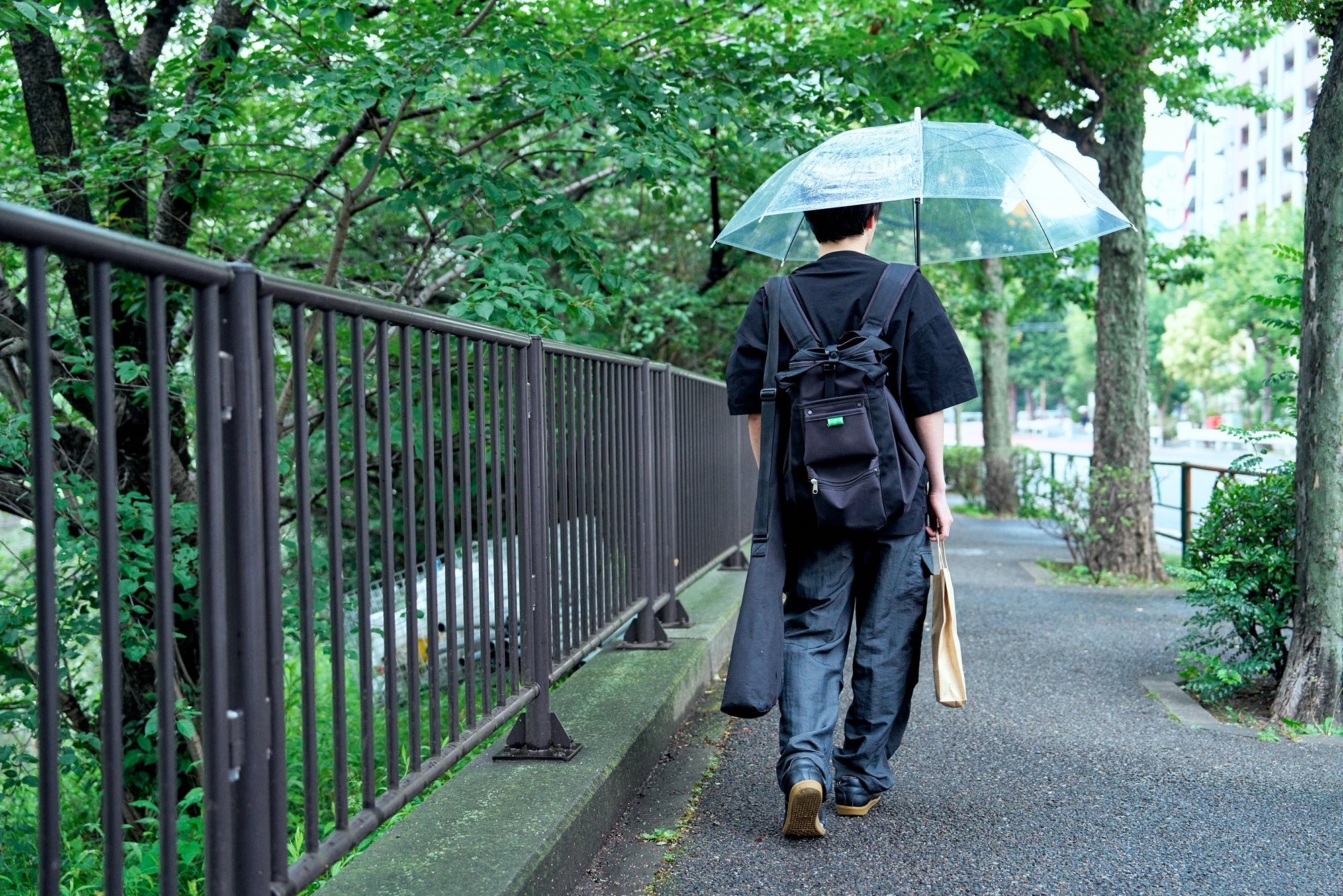 Casash+を使用する事により、リュックやランドセルに取り付けて傘を手ぶらでさす事ができます。