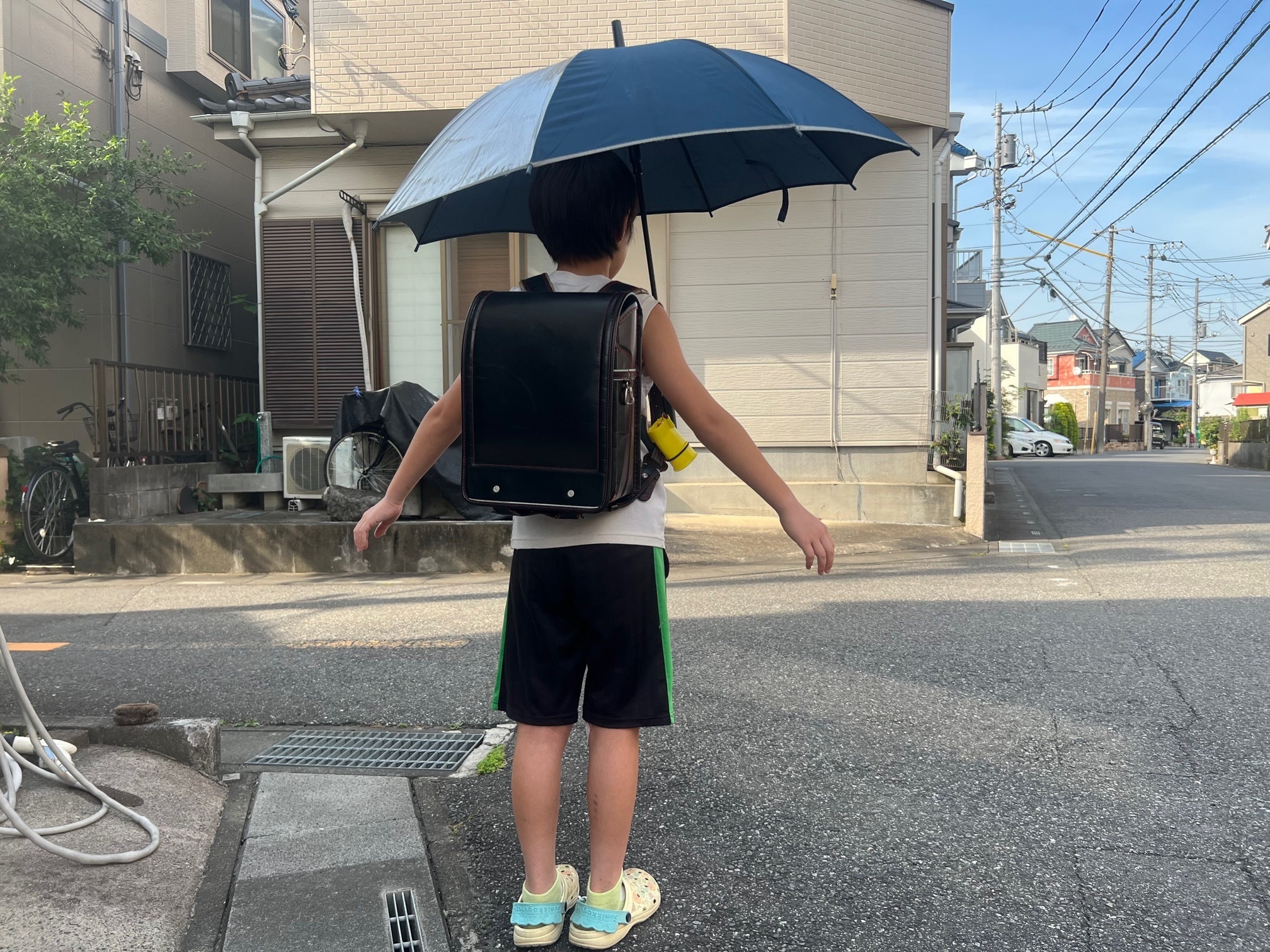 特に手荷物の多いい小学生!手ぶらで傘をさす事によって楽になります。