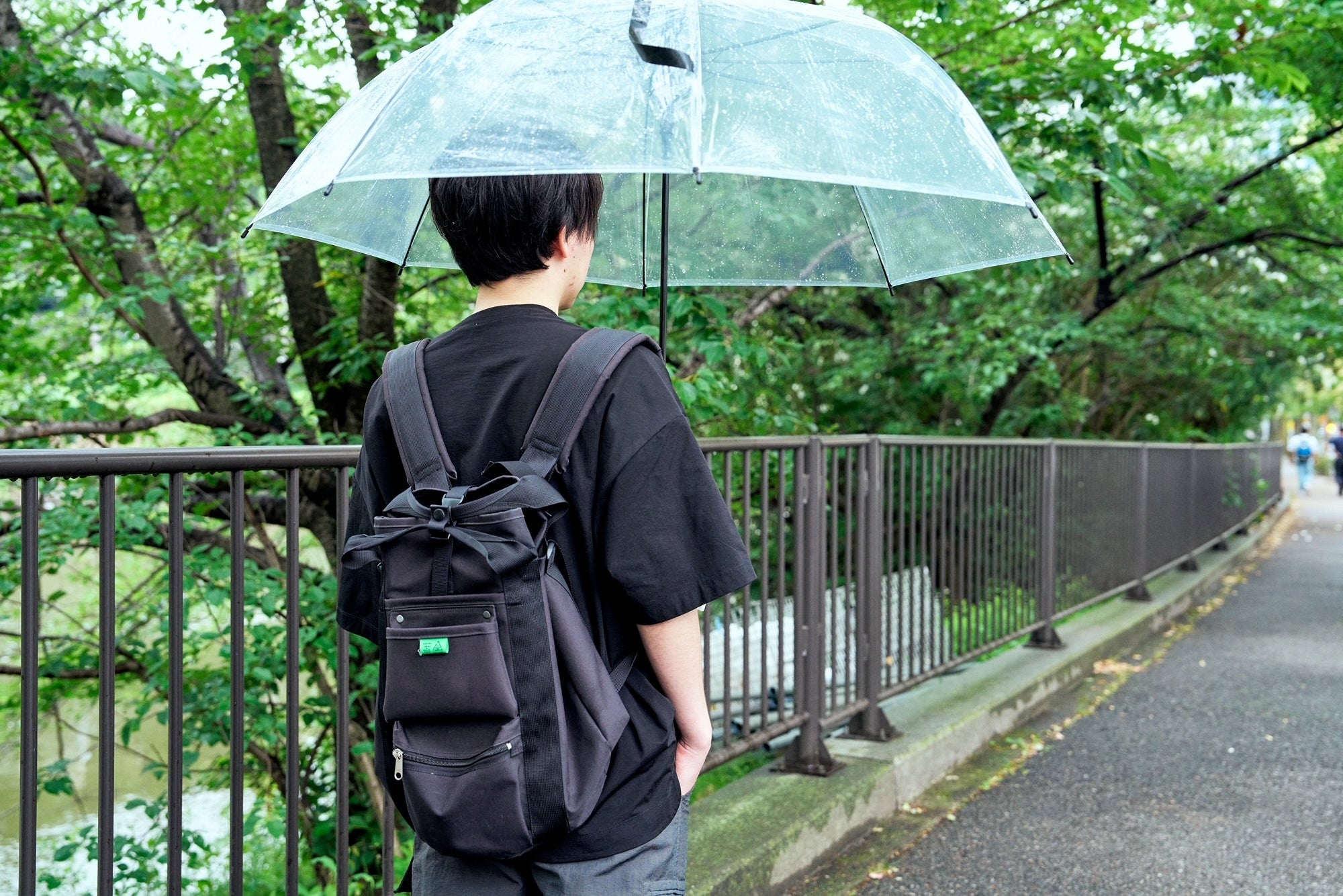 もちろん使用しない時や、傘を畳む時は、手を濡らさず綺麗にたたみ水滴をきり、リュックやランドセルに取り付けて、手ぶらで移動ができます。