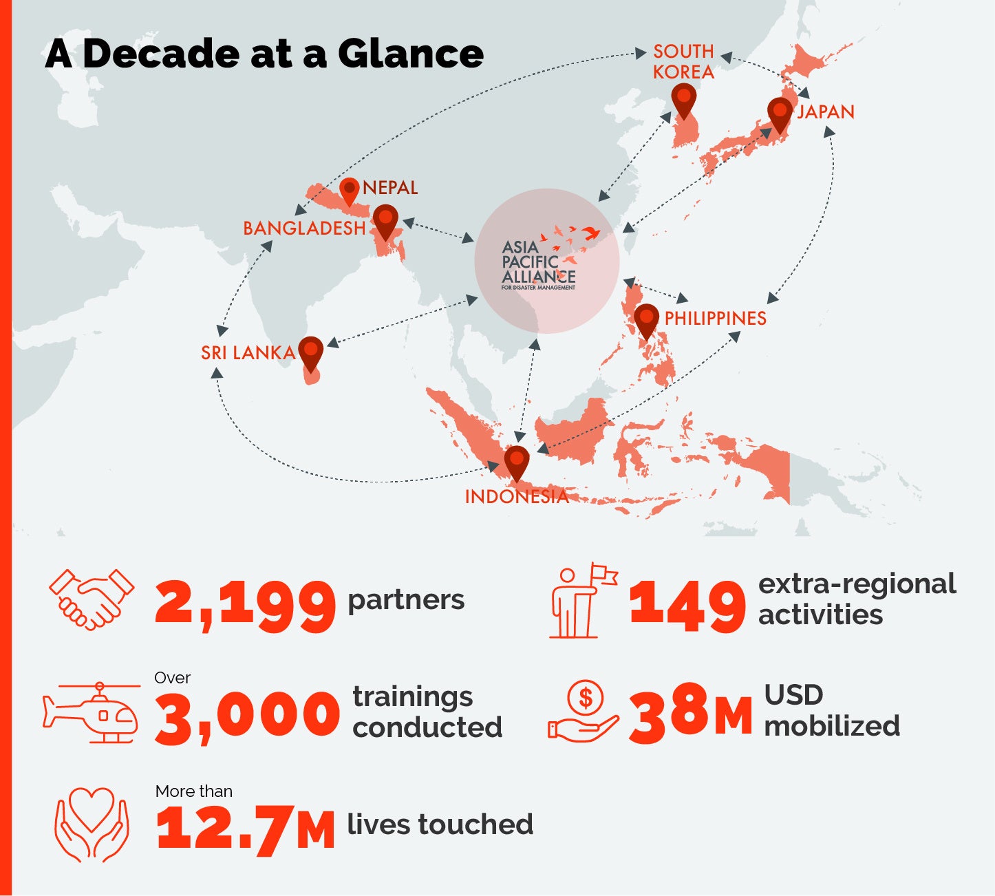 アジア太平洋地域の国々はこれまで多くの自然災害の被害を受けてきました。このような自然災害を予防し被害を最小限にするため、ビジネス・非政府組織(NGO)・地域コミュニティ・政府・地方自治体が協力して相互に助けあう体制の構築が急務です。このため、アジア太平洋地域の国々が協力し、効果的かつ迅速に防災・減災・災害対応・復興支援を行うための国境を超えた災害支援連携組織を設立しました。現在、以下の2つを軸に活動しています。