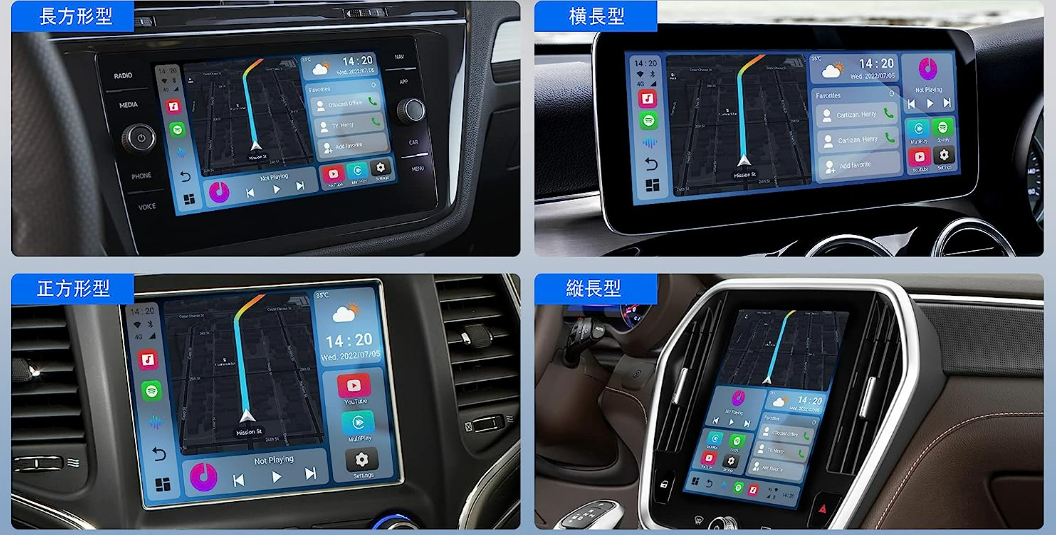 本製品は画角自動調整機能を搭載しており、長方形型、横長型、正方形型、縦長型等様々なナビの形に対応し自動でリサイズ化します。固定メニューバーは左右に変更可能です。
