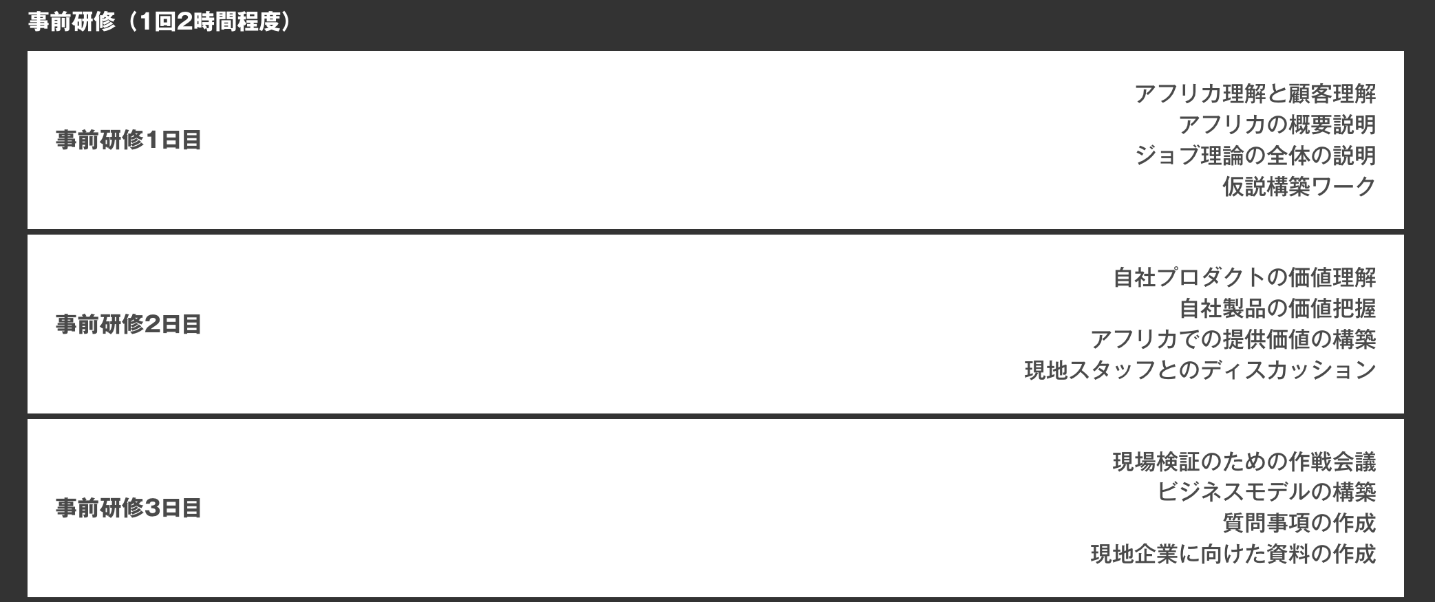 事前研修では、顧客の特定、顧客のニーズや困りごとの把握、参加者が持っている製品やサービスの価値を考えるワークショップを実施し、現地顧客に対する理解と仮説を構築していただきます。