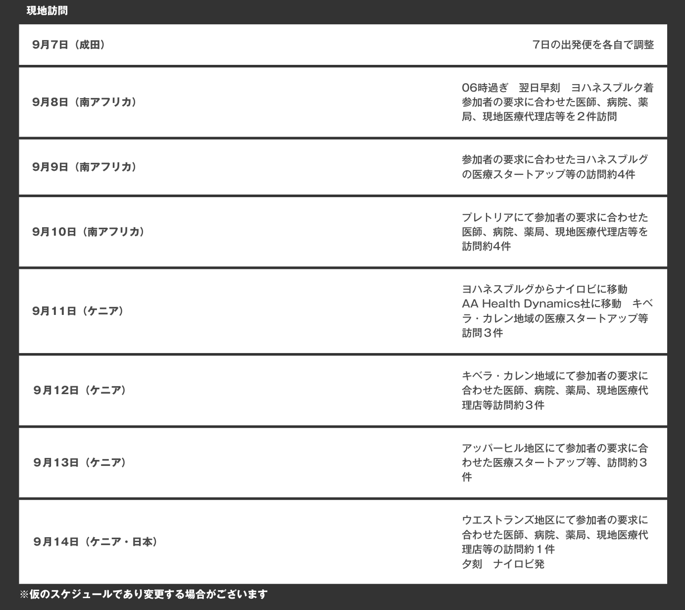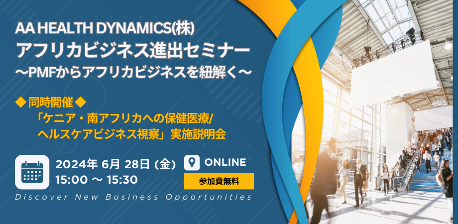 AA Health Dynamics株式会社(以下、「AAHD社」と言う。)は、今秋2024年9月7日〜14日に、アフリカでの事業展開などを検討している法人担当者様などを対象に、南アフリカ共和国とケニア共和国に赴き、現地のヘルスケアビジネスを視察するプログラム(以下、「本プログラム」と言う。)を開催することとなりましたので、ご案内します。
