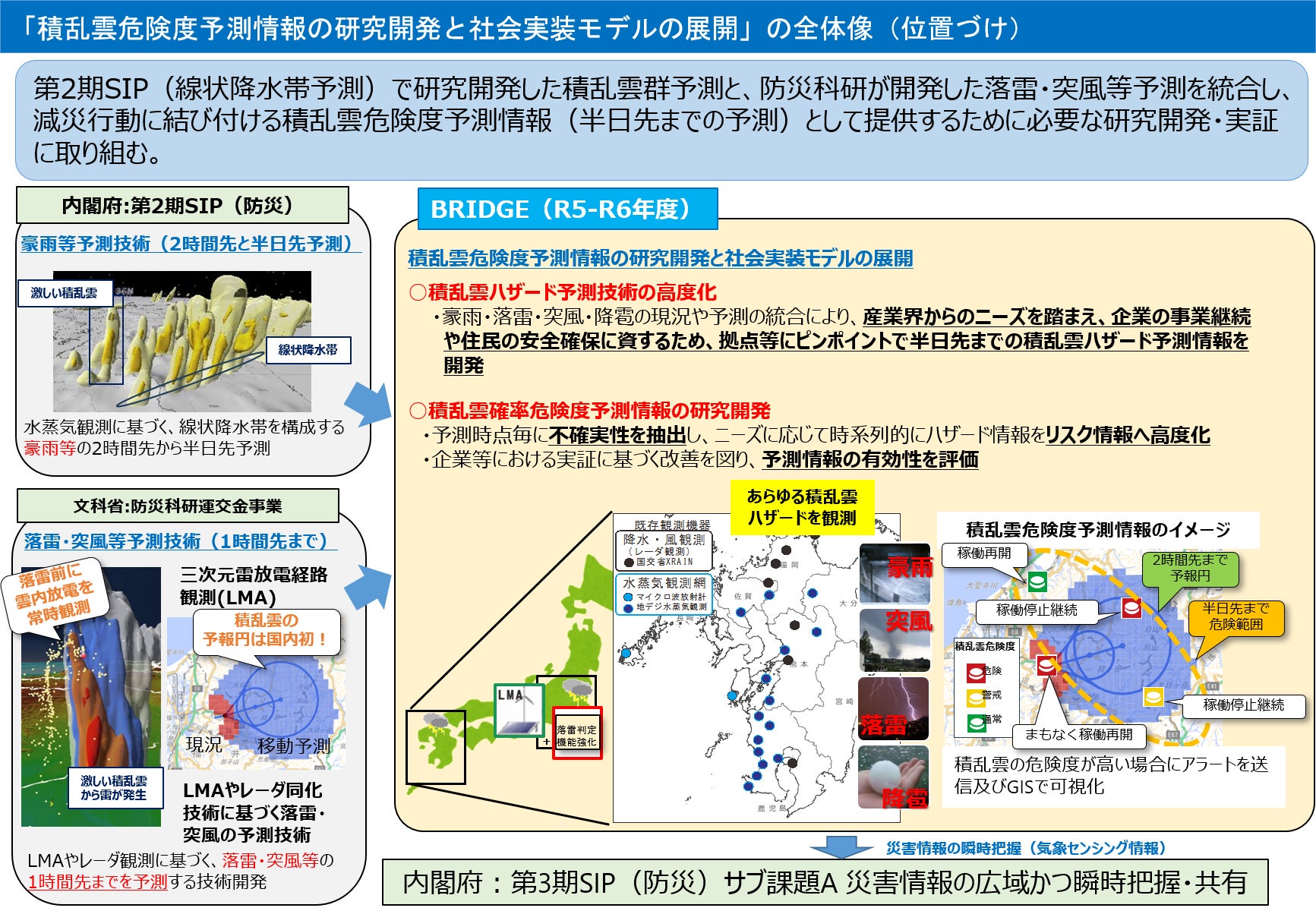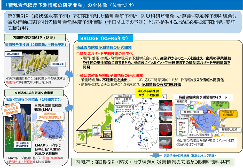 本取組は、内閣府「研究開発成果の社会実装への橋渡しプログラム(BRIDGE)」の施策の一つとして、内閣府「戦略的イノベーション創造プログラム(SIP)」第2期「国家レジリエンス(防災・減災)の強化」における「線状降水帯観測・予測システム開発」の成果である積乱雲群予測と、防災科研が開発した落雷・突風等予測を統合し、産業界からのニーズを踏まえ、企業の事業継続や住民の安全確保に資するため、拠点等にピンポイントで半日先までの積乱雲ハザード予測情報を開発します。さらに、これを基に積乱雲危険度予測手法の高度化と精度向上を進め、積乱雲危険度予測情報配信の実証実験を実施し、九州地方の積乱雲危険度予測情報のリアルタイム配信を実施します。