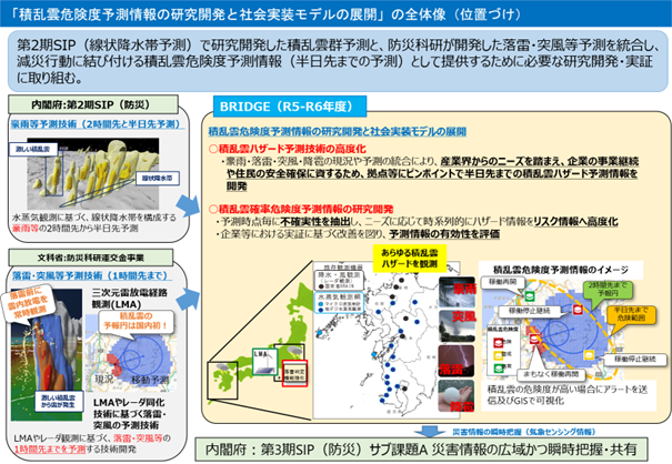 内閣府「戦略的イノベーション創造プログラム(SIP)」第2期「国家レジリエンス(防災・減災)の強化」において線状降水帯予測のために開発した、水蒸気観測に基づく線状降水帯を構成する激しい積乱雲群の2時間先予測および水蒸気観測データ同化手法は、豪雨、落雷、突風予測の信頼性確保においても重要性が高いものです。また、第2期SIPにおいて線状降水帯予測のために開発した積乱雲群の半日先予測も事業継続の可能性の早期検討においても重要性が高いものです。