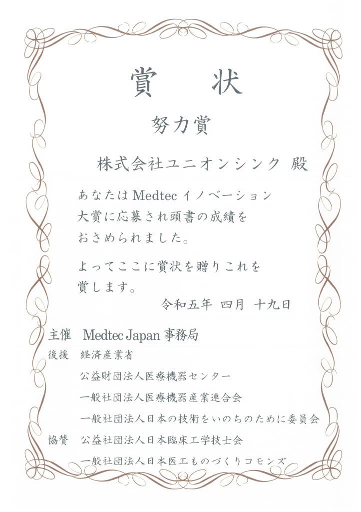 国内唯一の医療機器展示会Medtec Japanにて、第11回「Medtecイノベーション大賞」努力賞を受賞<株式会社ユニオンシンク>