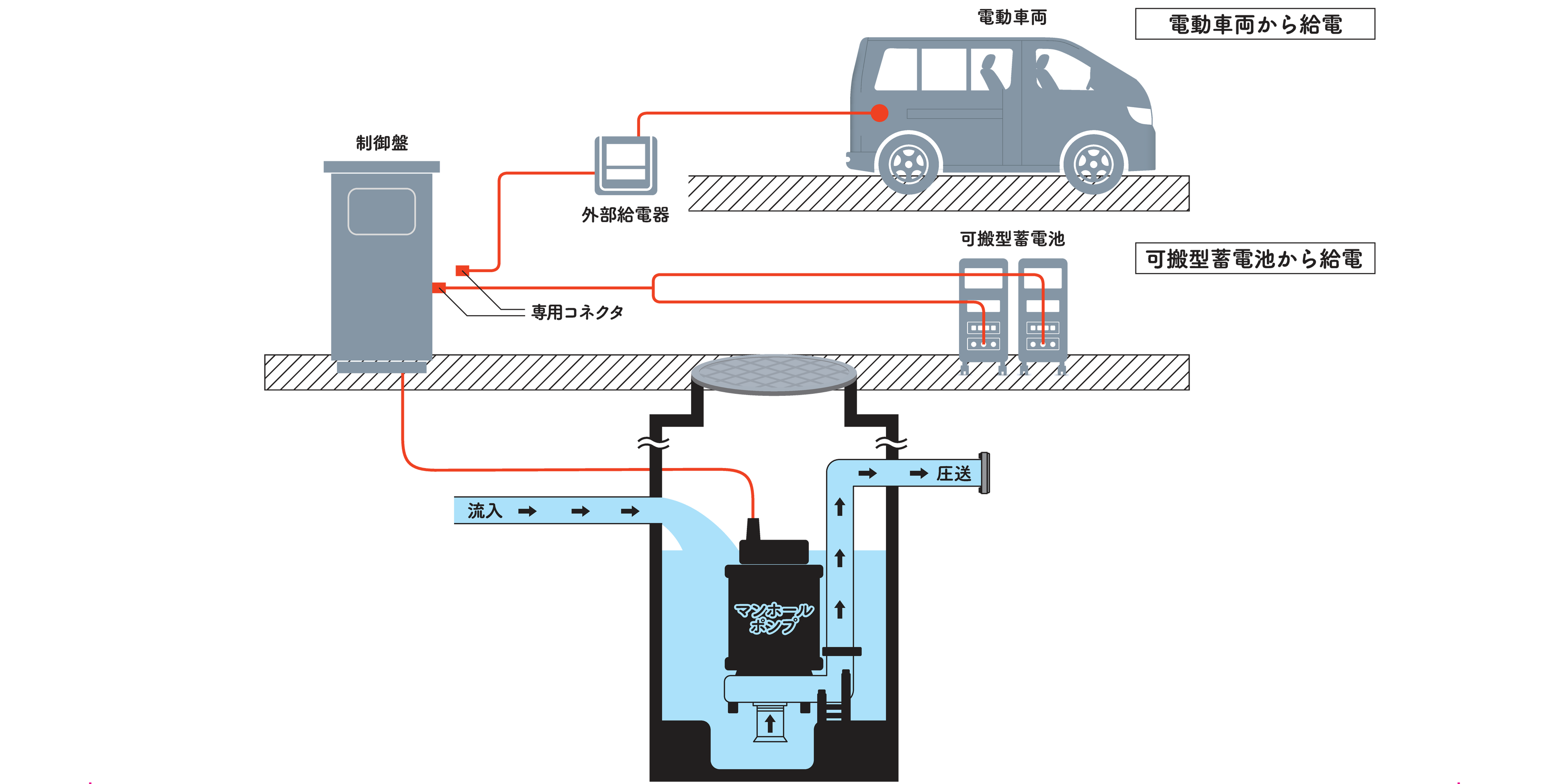 停電等により商用電源が喪失した場合、可搬型蓄電池または電動車両の電源を用いて、停止したマンホールポンプを起動することができます。