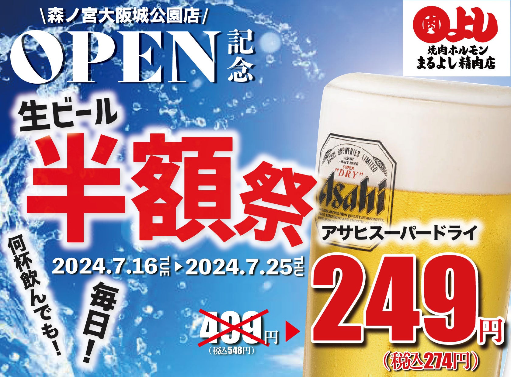 そこで焼肉ホルモンまるよし精肉店(https://maruyoshi-seiniku.com)では『森ノ宮大阪城公園店』のオープンを記念して、既存の9店舗にて生ビール半額祭を2024年7月16日(火)~7月25日(木)に実施致します。