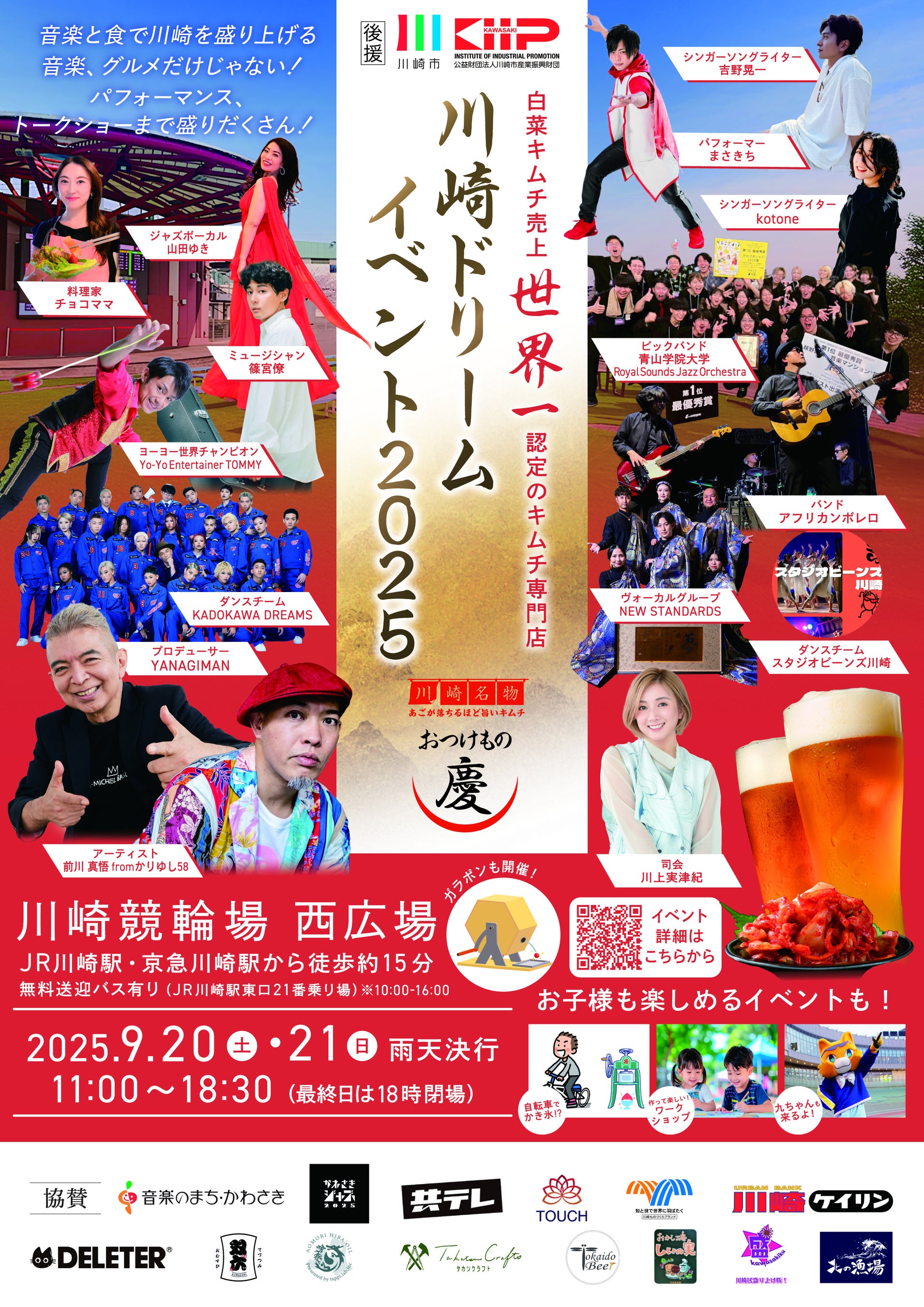 2025年9月20日(土)・21日(日)の2日間、川崎競輪場 西広場にて、世界一のキムチ専門店「おつけもの慶」(運営会社:グリーンフーズあつみ、本社:神奈川県川崎市、代表取締役:渥美和幸)が主催し、川崎市/音楽のまち・かわさき推進協議会/かわさきジャズ実行委員会などと連携した「川崎ドリームイベント2025」を開催いたします。