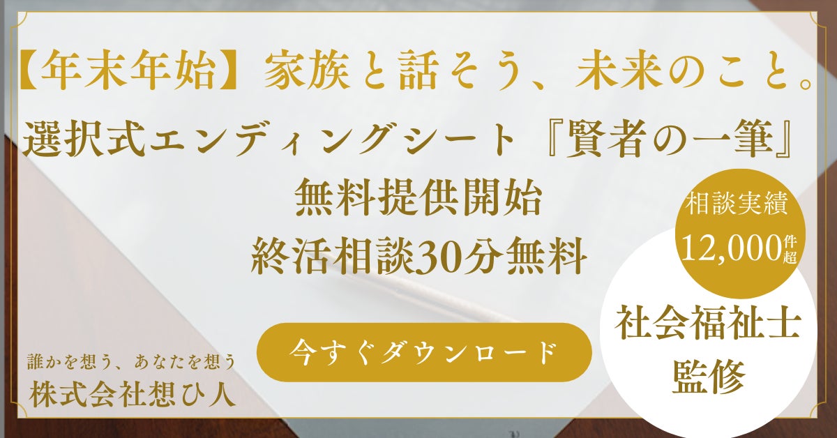 株式会社想ひ人(本社:東京都[所在地]、代表取締役:金子 萌)は、年末年始に家族で話し合うきっかけとして、誰でも簡単に作成できる選択式エンディングシート『賢者の一筆』の無料提供を2024年12月25日より開始いたします。