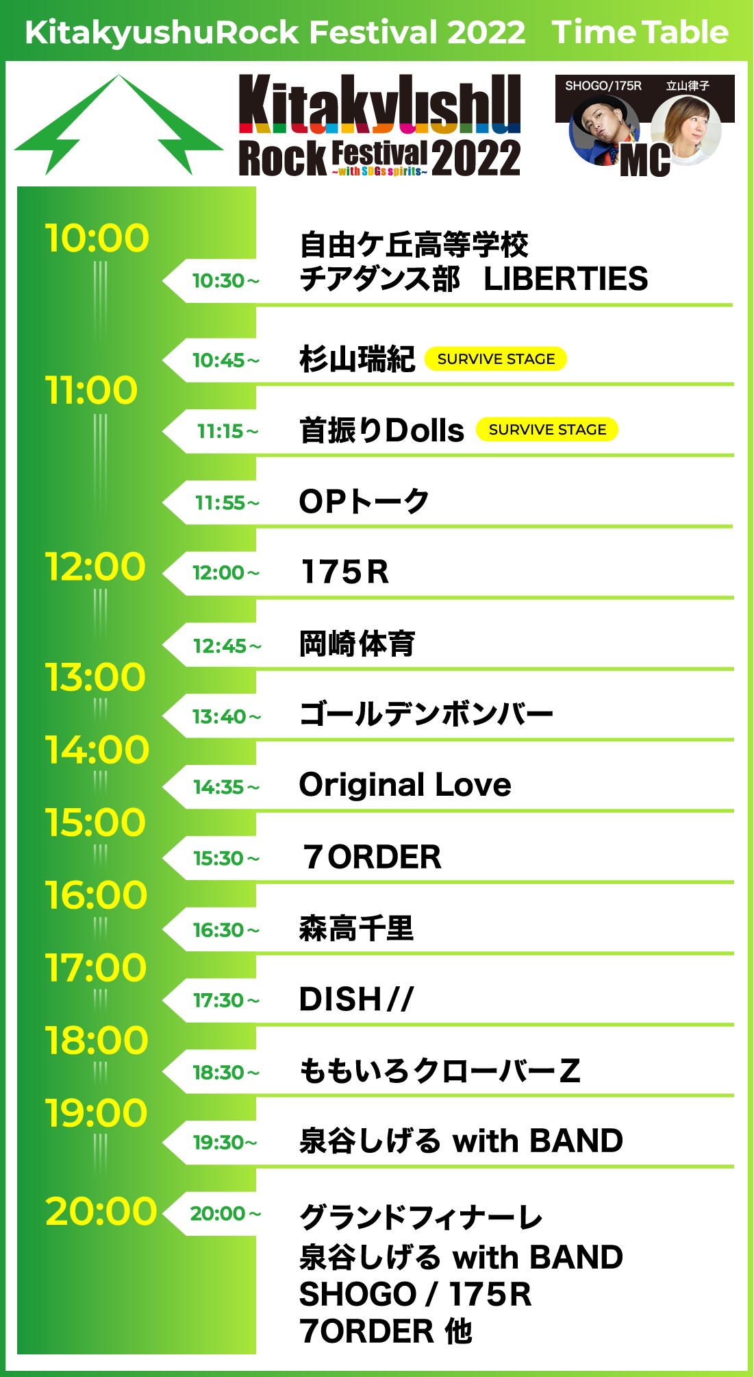 泉谷しげるが発起人を務める「北九州ロックフェスティバル 2022 with SDGs spirits」は、第二弾出演アーティストとして岡崎体育、ゴールデンボンバーの出演に加え、出演権を賭けたオーディション企画「北九SURVIVE!!」で選出されたアーティスト2組を含めた、全出演アーティストを発表。また、ライブパフォーマンスのタイムテーブルを公開いたしました。