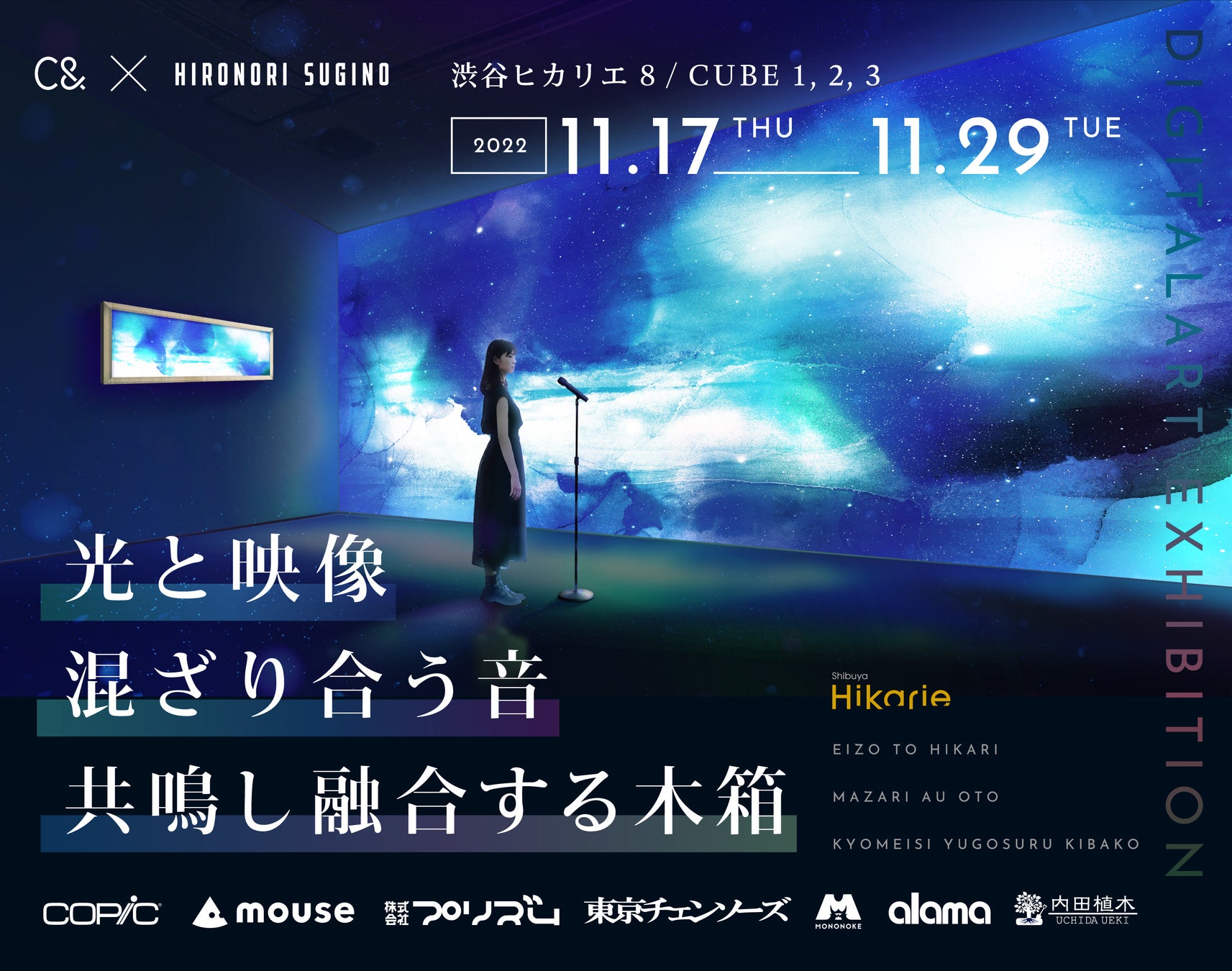 | 【開催概要】 C& DigitalArt Exhibition「光と映像 ー 混ざり合う音 / 共鳴し融合する木箱」 場所:渋谷ヒカリエ 8/ CUBE 1, 2, 3 会期:2022年11月17日(木)〜29日(火)11:00〜20:00 ※最終日は16:00まで 入場料:無料 主催:シーエンド株式会社 特別協賛:株式会社トゥーマーカープロダクツ・株式会社マウスコンピューター・株式会社プリズム 協賛:株式会社東京チェンソーズ・株式会社MONONOKE・株式会社alama・内田植木 問い合わせ:info@c-and.info ヒカリエWeb:https://www.hikarie8.com/cube/2022/10/c-digitalart-exhibition.shtml 特設サイト:https://c-and.info/hikari |
