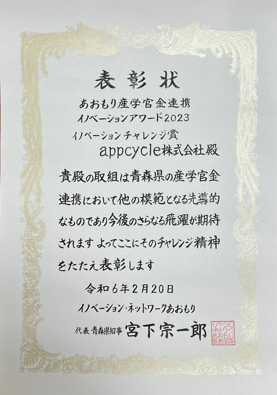青森発スタートアップappcycle株式会社が、あおもり産学官金連携イノベーションアワード2023にて、「イノベーションチャレンジ賞」受賞!