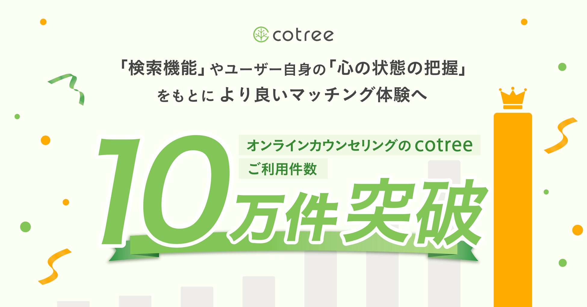オンラインカウンセリングのcotree、ご利用件数が10万件を突破!検索機能やユーザー自身の心の状態の把握をもとに、より良いマッチング体験へ