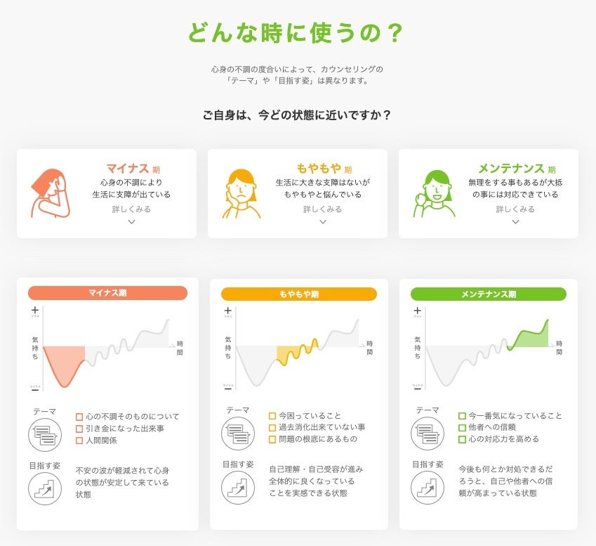 心身の不調の度合いによって、カウンセリングの「テーマ」や「目指す姿」は異なります。そこで、ユーザー自身が今の状態に近いものを選択し、自身の状態を客観的に把握していただくことで、初めてカウンセリングを受ける方にもカウンセリングの展開やゴールを想像しやすいようになりました。