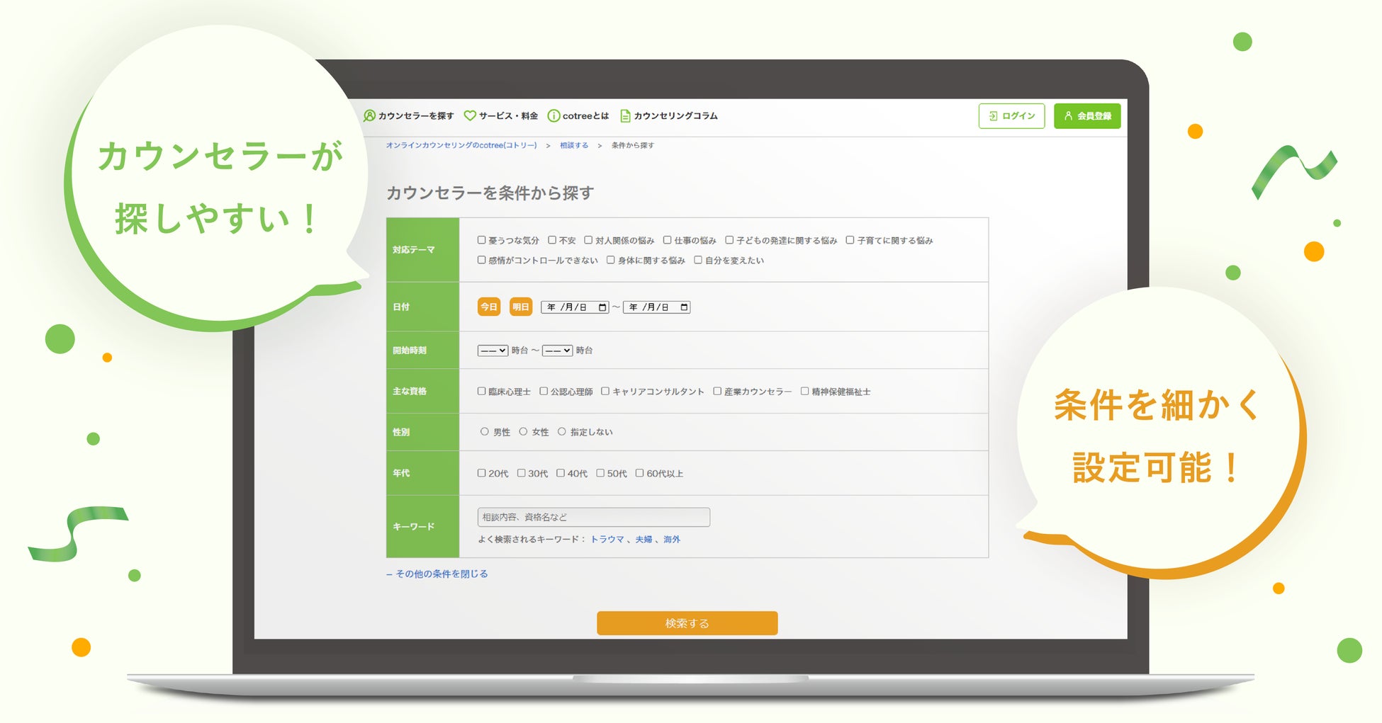 オンラインカウンセリング・コーチング事業を展開する株式会社cotree(本社:東京都中央区、代表取締役:西岡 恵子、以下cotree)は、2014年10月にサービス開始以降、「話すカウンセリング」と「書くカウンセリング」の合計ご利用件数が10万件を突破しました。またユーザーとカウンセラーの増加に伴い、より良いマッチング体験を提供するため、これまでご要望が多かったカウンセラーの検索画面の改善や、ユーザー自身の心の状態が把握できるよう、サービスサイト情報のリニューアルを実施しました。