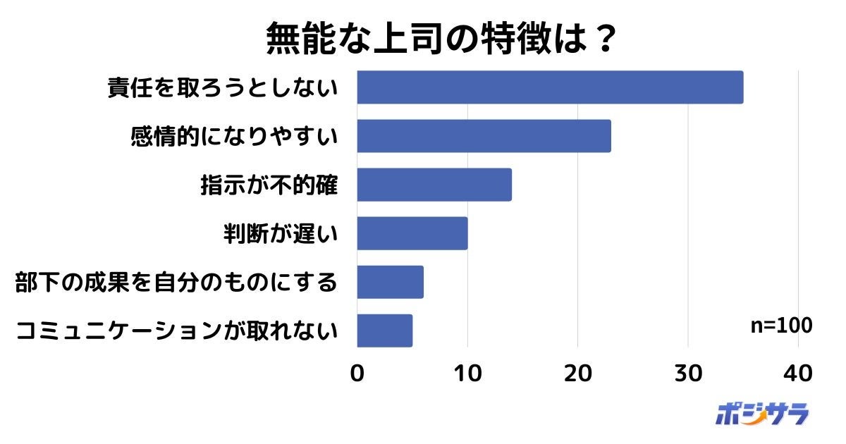 感情的になりやすく責任を取らない上司は、どの年代でも共通して上司が無能だと感じる特徴だということがアンケート調査でも伺えます。