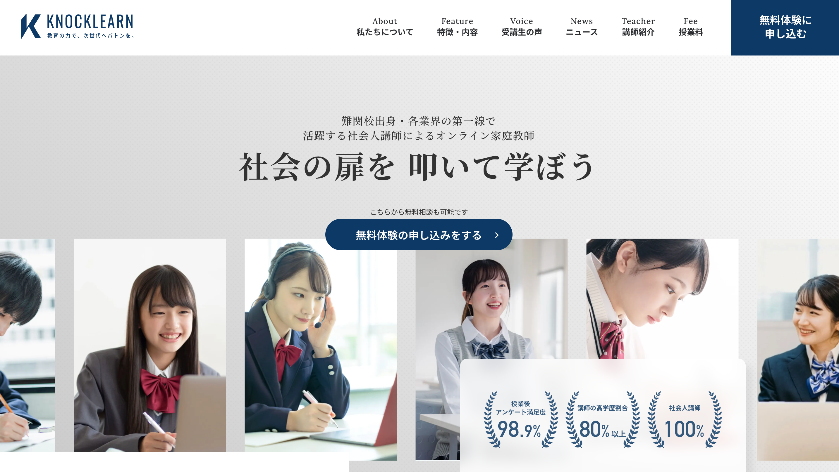 KnockLearnは「社会の扉を叩いて(Knock)学ぼう(Learn)」を掲げた、難関校出身で現在も様々な分野で活躍する社会人講師が、ワンランク上の授業をお届けするオンライン家庭教師サービスです。