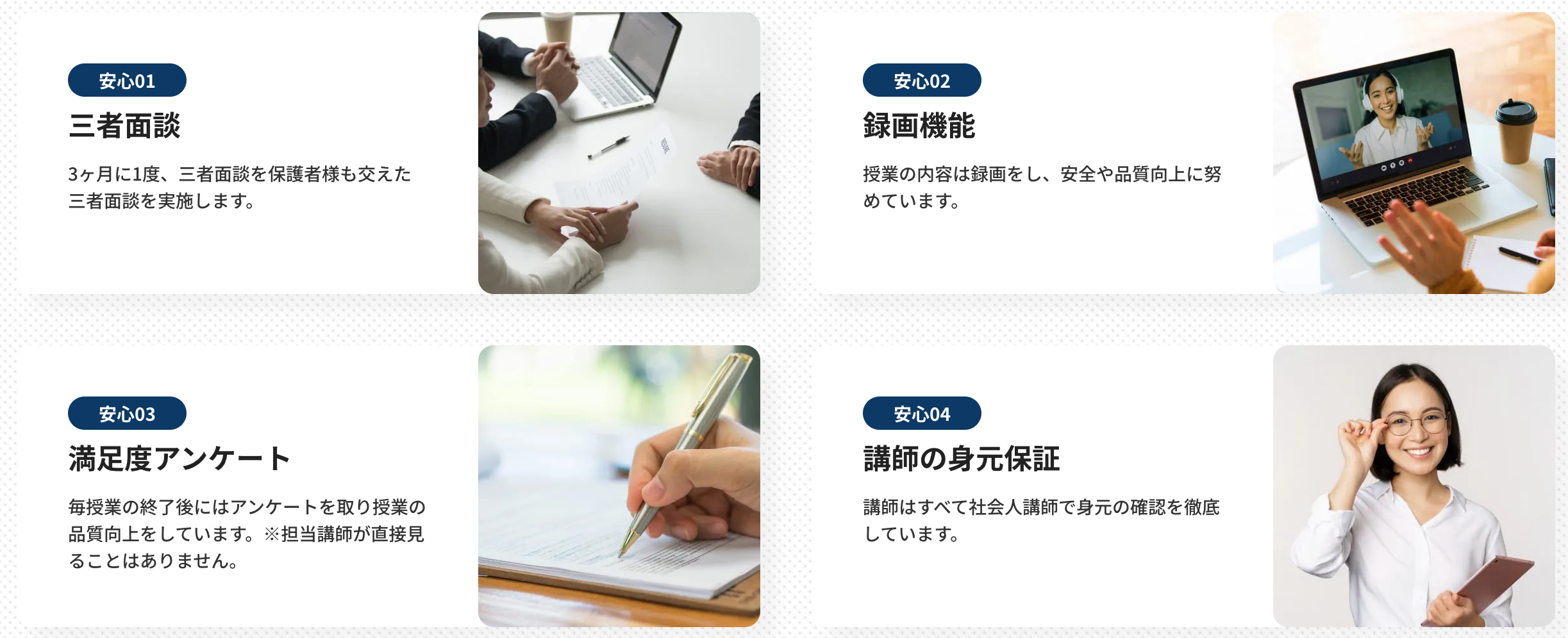 KnockLearnは、保護者さまにも安心して預けていただけるよう授業や講師の見える化を実施しています。成績や現在の状況なども三者面談を通してより「わかりやすく」知ることができます。