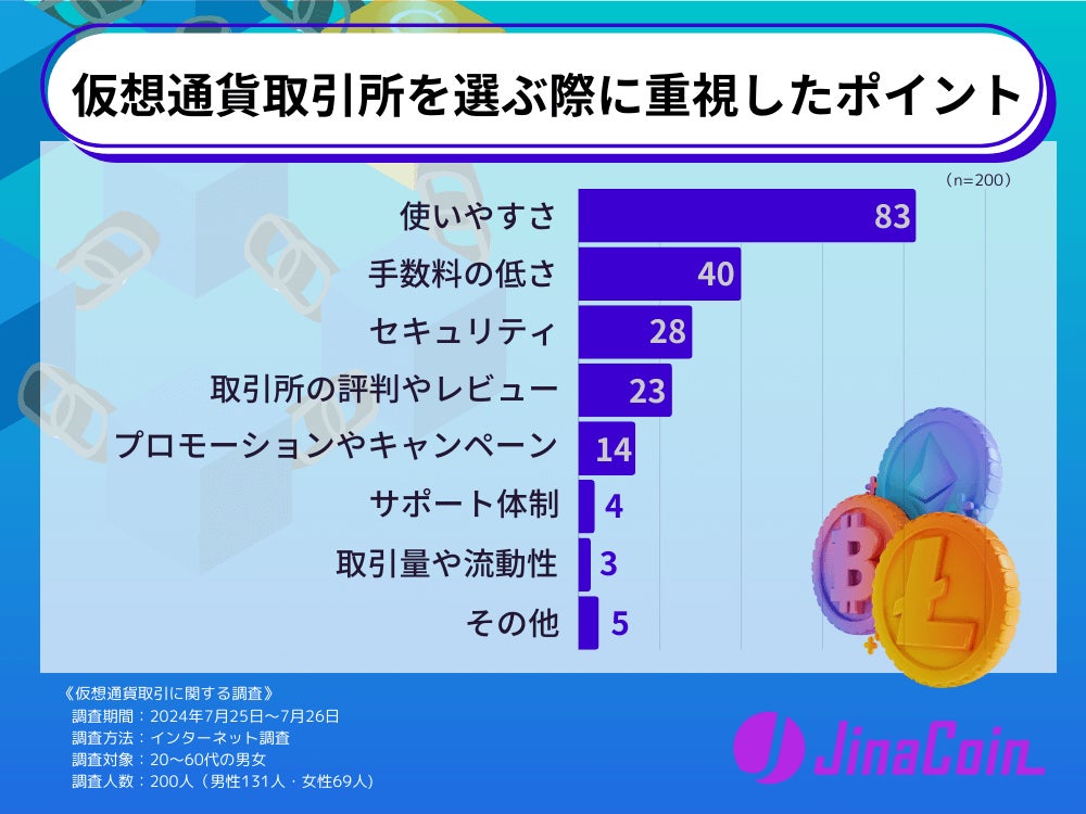 仮想通貨取引所を選ぶ際に重視したポイントとして、使いやすさと答えた人が83票、手数料の低さが40票、セキュリティが28票でした。仮想通貨を購入する際に売買のしやすさや扱いやすさを気にする人が多かったと言えるでしょう。