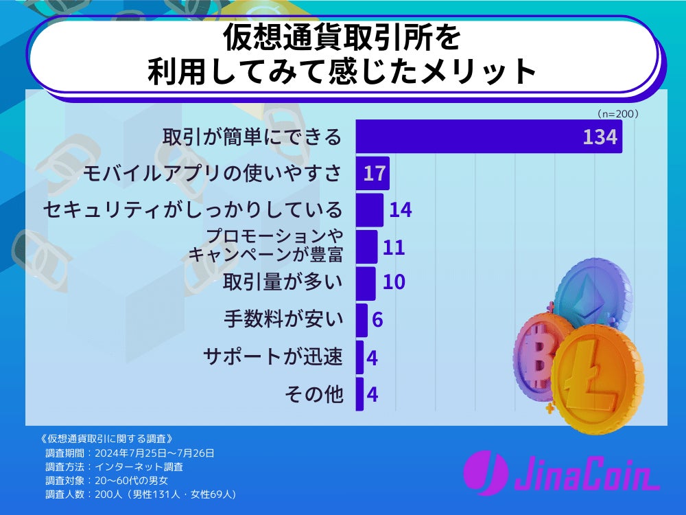 仮想通貨取引所を利用してみて感じたメリットとして、取引が簡単にできると答えた人が134票と圧倒的で、2位以下に大差をつけました。取引所を選ぶ際に重視したポイントで、使いやすさと答えた人が83票だったことを考えると、使いやすさを重視する考え方は間違いではないことが言えます。