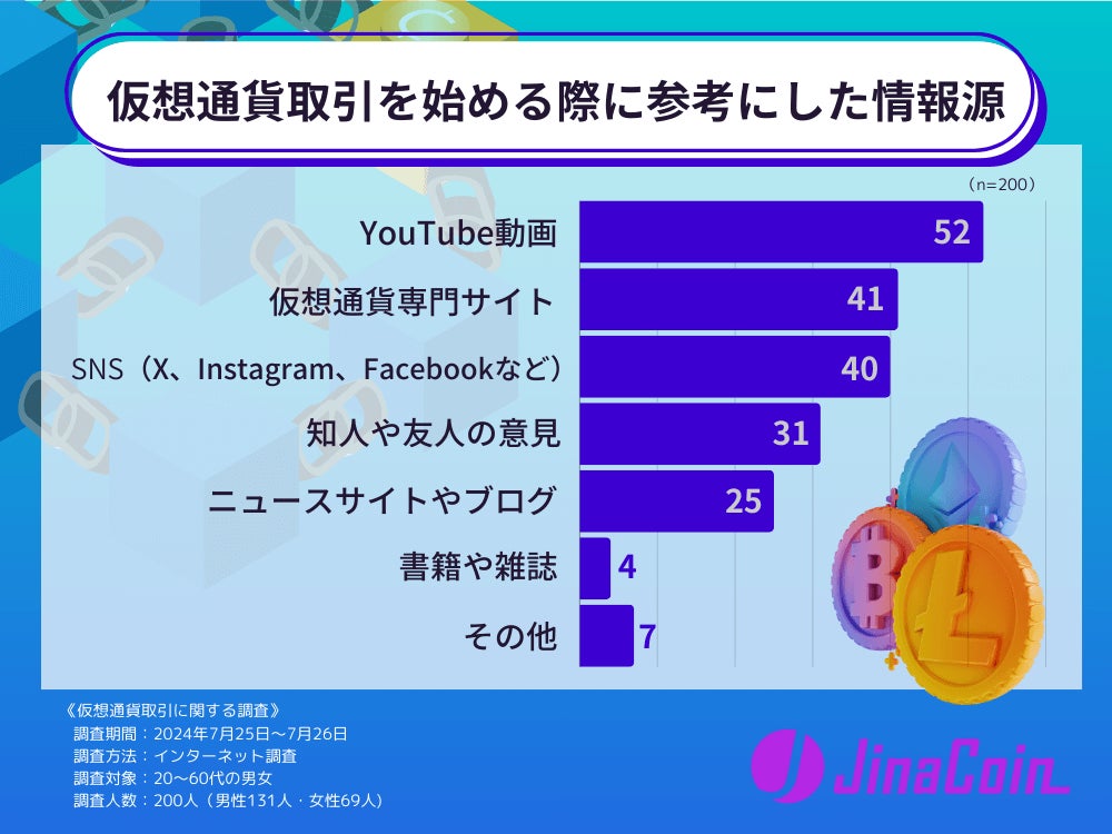 仮想通貨取引を始める際に参考にした情報源として、意外にも「YouTube動画」が最も多く52票を集めたほか、仮想通貨専門サイトが41票、XやインスタグラムなどのSNSが40票と続きました。その次が知人や友人の意見で31票、ニュースサイトやブログは25票、書籍や雑誌はわずか4票でした。