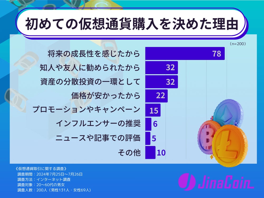 初めての仮想通貨購入を決めた理由としては、「将来の成長性を感じたから」が78票と多く、「知人や友人に勧められたから」と「資産の分散投資の一環として」が32票で並びました。ビットコインやイーサリアムなど価格の上昇が続いていることも、将来の成長性を感じる要素と言えます。また、仮想通貨は普段の買い物で決済に使えるなど、さまざまな目的で利用できるのもポイントです。