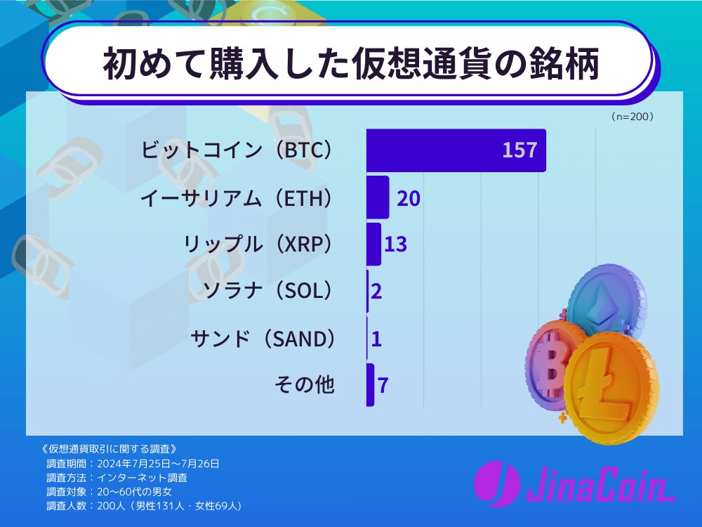 初めて購入した仮想通貨の銘柄では、圧倒的にビットコインが多く、実に157票と8割ほどの支持を集めました。次にイーサリアムで20票、リップル13票と続き、この3つの仮想通貨だけで95%を占めています。