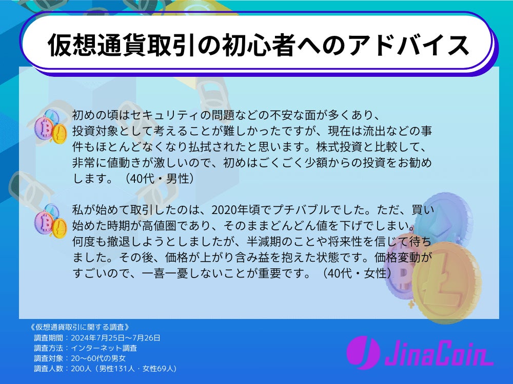仮想通貨取引の初心者へのアドバイスとしてさまざまなコメントが寄せられました。30代男性は、「仮想通貨の取引はまだまだ歴史が浅く、過去のデータで今後の仮想通貨の価格を予想するのは難しい。」と回答しています。