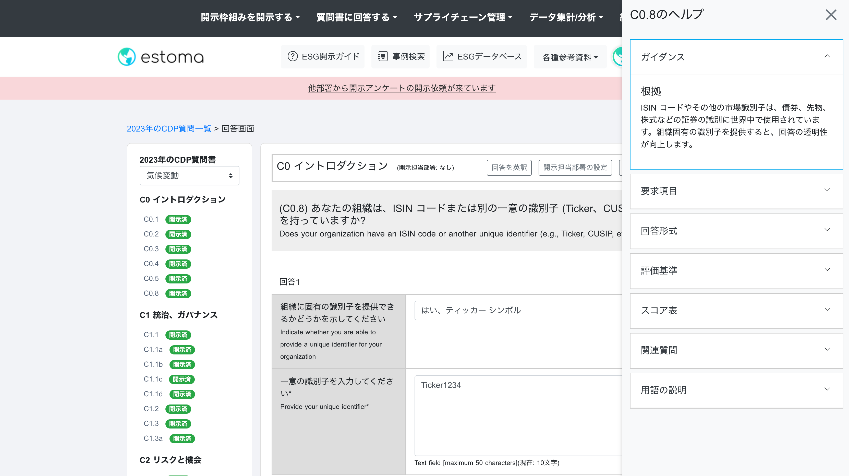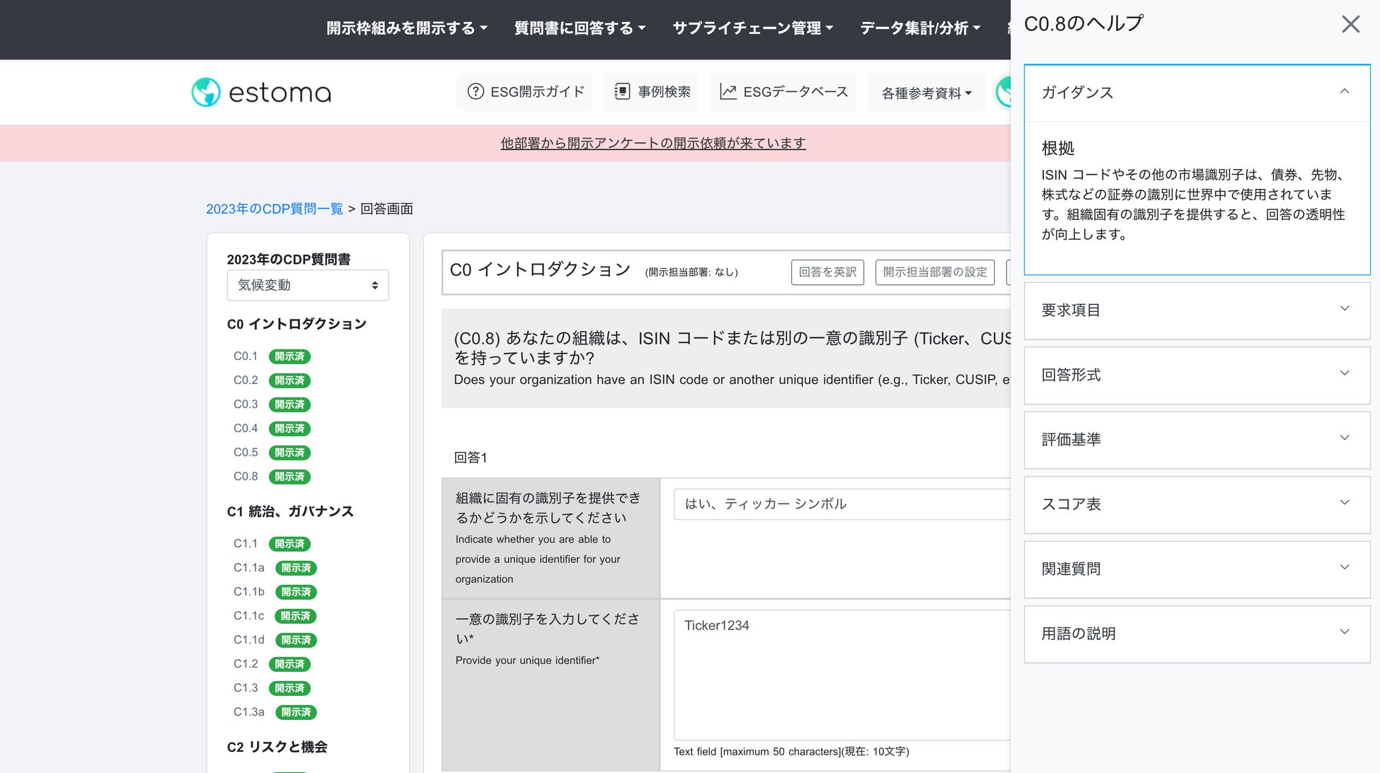 また、各評価機関の調査項目が微妙に異なることから、各調査で回答内容を整合させることにも労力が必要です。estomaでは、主要な評価機関の質問書に対する開示ガイダンスを用意しており、さらに、関連する他の質問書の確認機能や、メモ機能も実装しているため、回答の整合性を簡単に担保することができます。