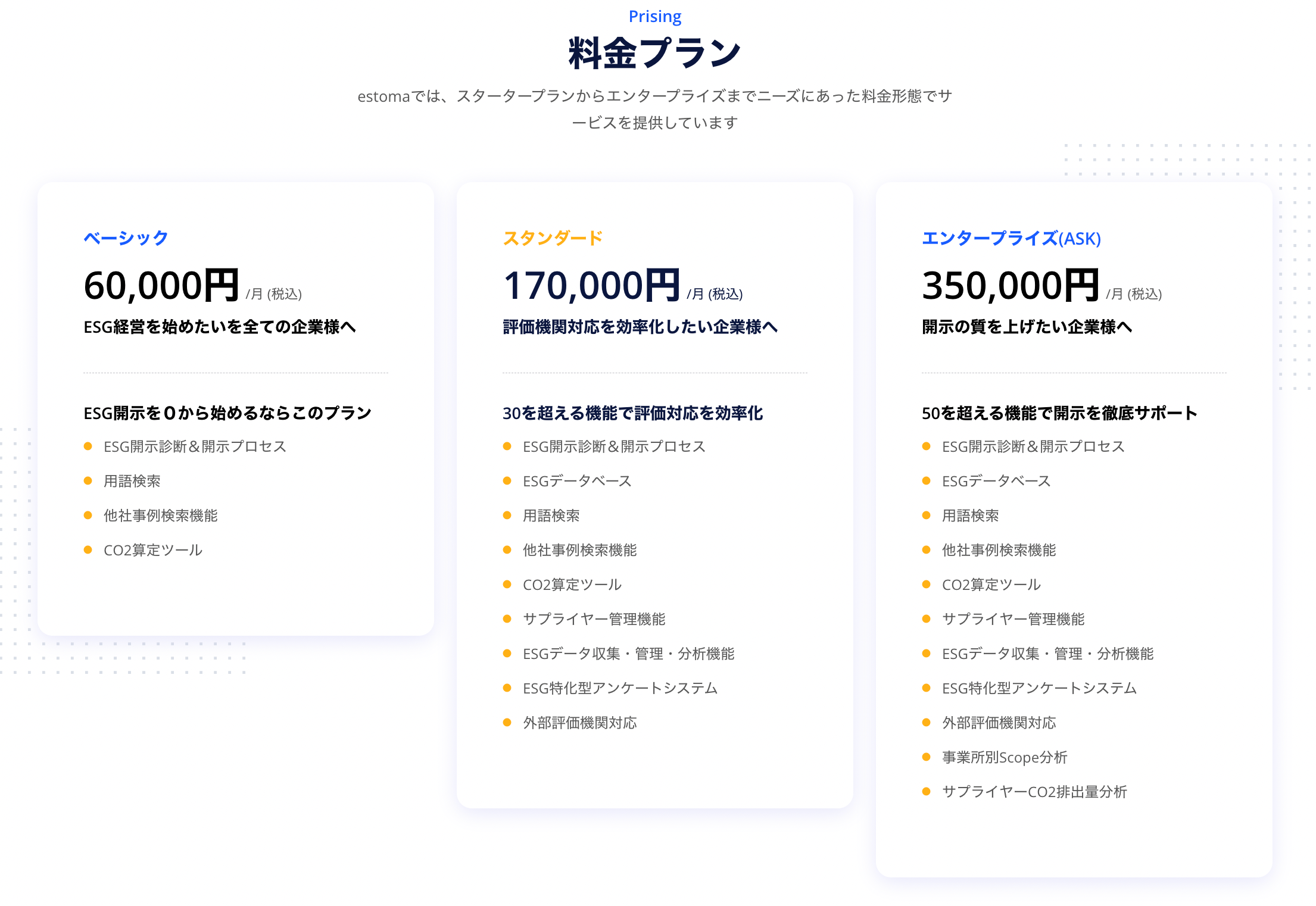 ESG情報開示を始めるお客様に向けたベーシックプラン。外部評価機関への対応を支援するスタンダードプラン。ESG情報を統合的に管理をしたいエンタープライズプランの3つとなります。