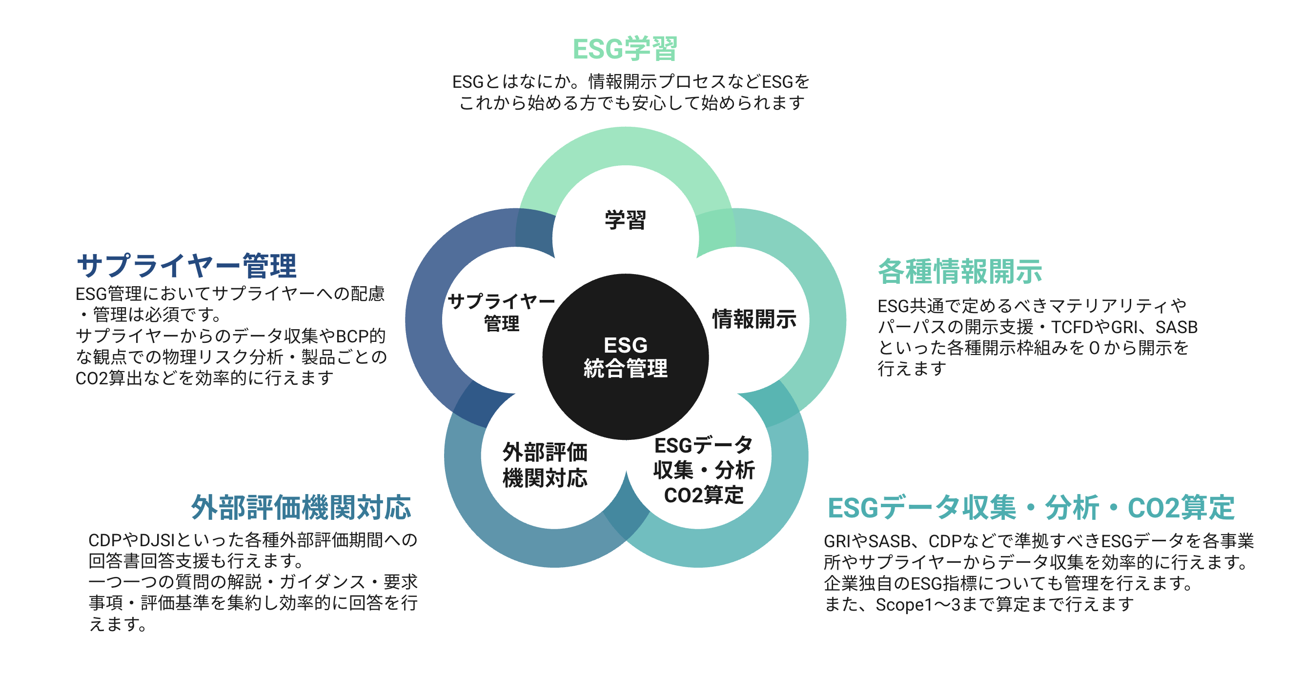 「ESGの学習」「ESG開示枠済み対応」「外部評価機関対応」「サプライヤー管理」「ESGデータ収集・分析・CO2算定」などESG開示における全ての取り組みや情報を管理できます。