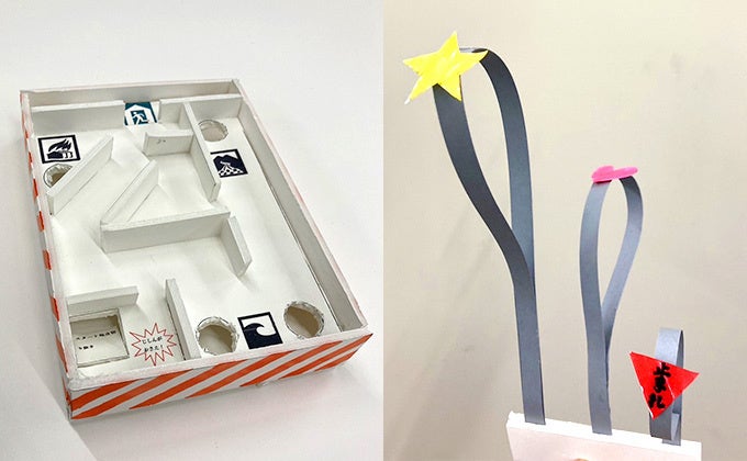 ハガキ大の立体迷路を手づくりします。 スタート地点からゴール地点に向かう間には、 地震によって発生した危険地帯や通行困難な場所が!無事に避難できるまで何度も挑戦しながら、 防災について考えることができます。