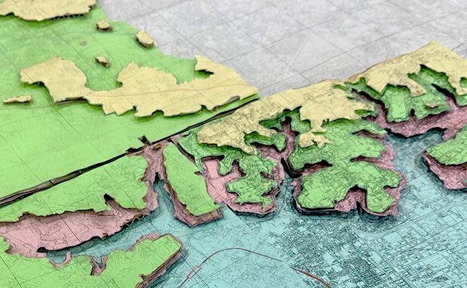 地形図を元にした立体地図のつくり方を学び、実際に、教育科学館とその周辺から荒川までの領域の立体地図をつくる科学教室です。出来上がった立体地図を見ながら、水害リスクとの向き合い方をみんなで一緒に考えます。