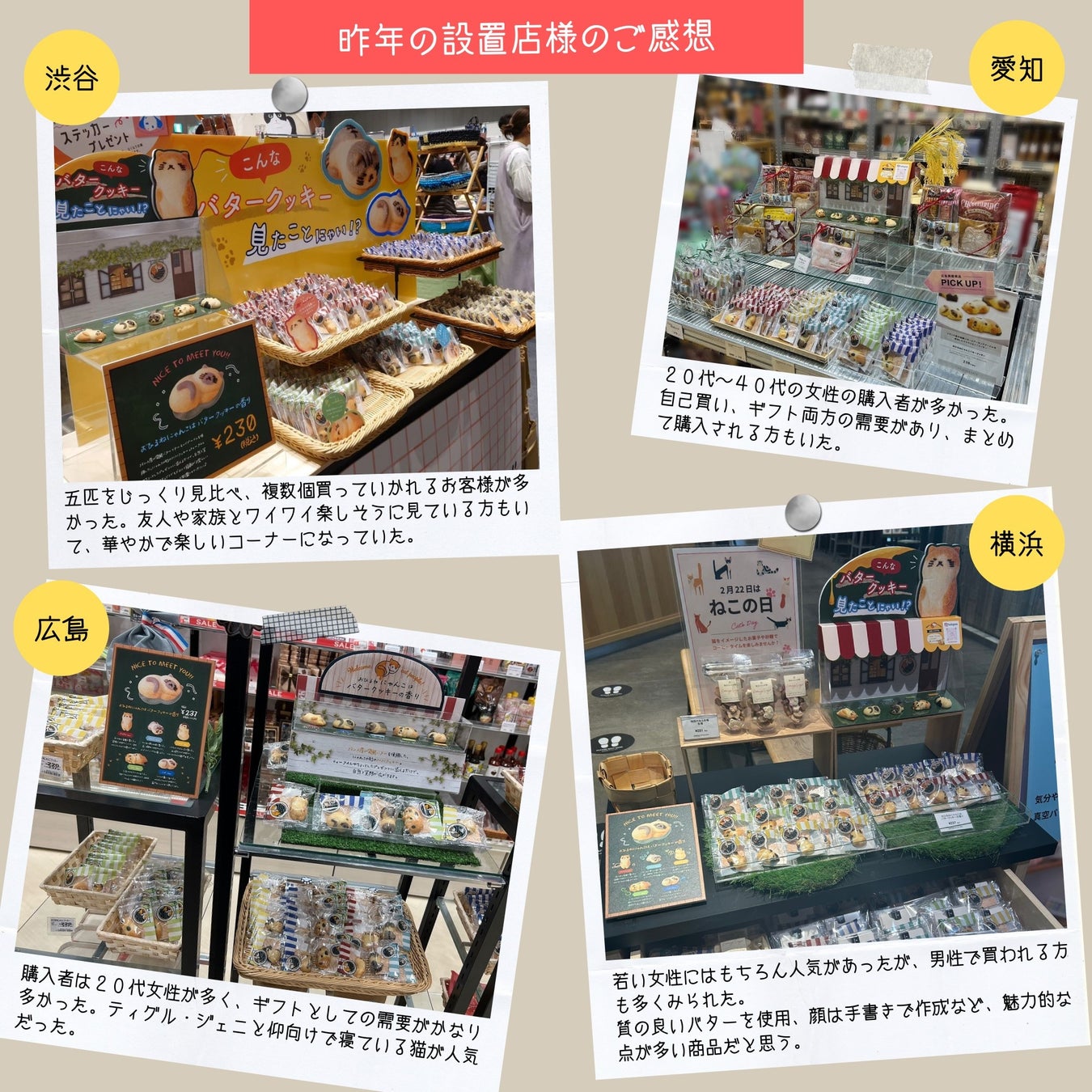*店頭販促ツールは先着400セット限定。おひるねにゃんこのメッセージ無しクッキーを、5匹×各20個以上(計100個以上)ご注文の店舗様への特典となります。