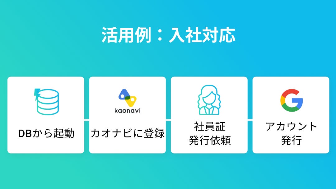 「カオナビ」と「Yoom」を連携することで、入社対応時のアカウント発行、従業員情報の更新などの業務をノーコードで自動化することが可能です。