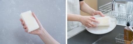 およそ70年※のウレタン製造技術を活かし、植物性素材でありながら、石油由来製品と同等の使用感を実現しました。ウレタンの目が細かいため繊細な泡を作り出すことができ、食器や調理器具をすっきりと洗い上げます。また、抗菌剤を配合していることに加え、水や空気の通り道を邪魔する膜を除膜加工で取り除くことで高い通気性を実現し、スポンジ自体の清潔も保ちます。一般的な石油由来のスポンジと同じように使用できるため、本製品を普段の食器洗い時に使用するだけで、無理なく環境に配慮した生活を送ることができます。
