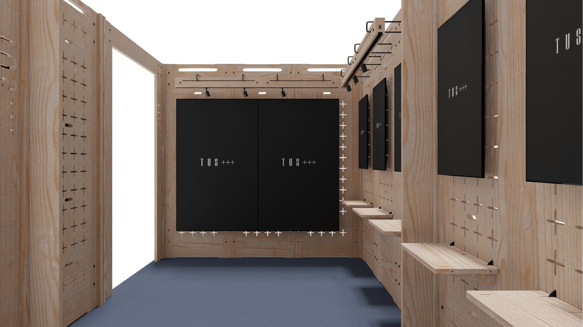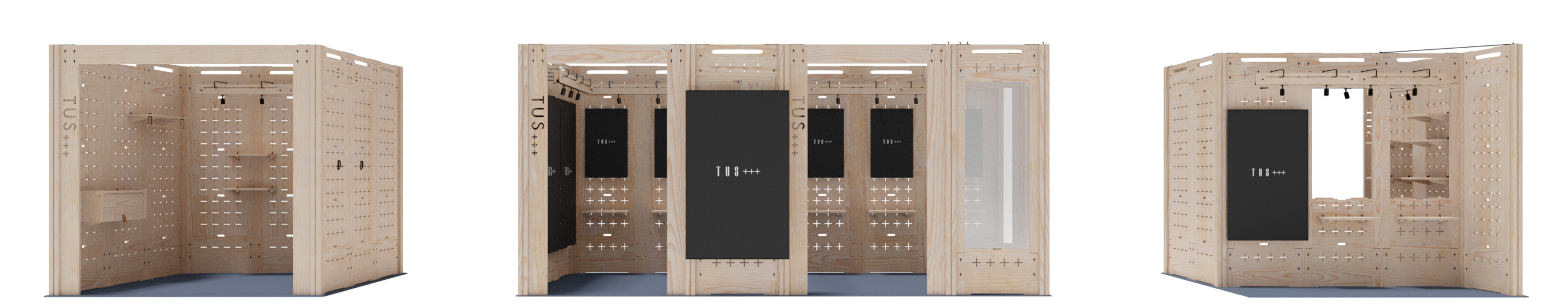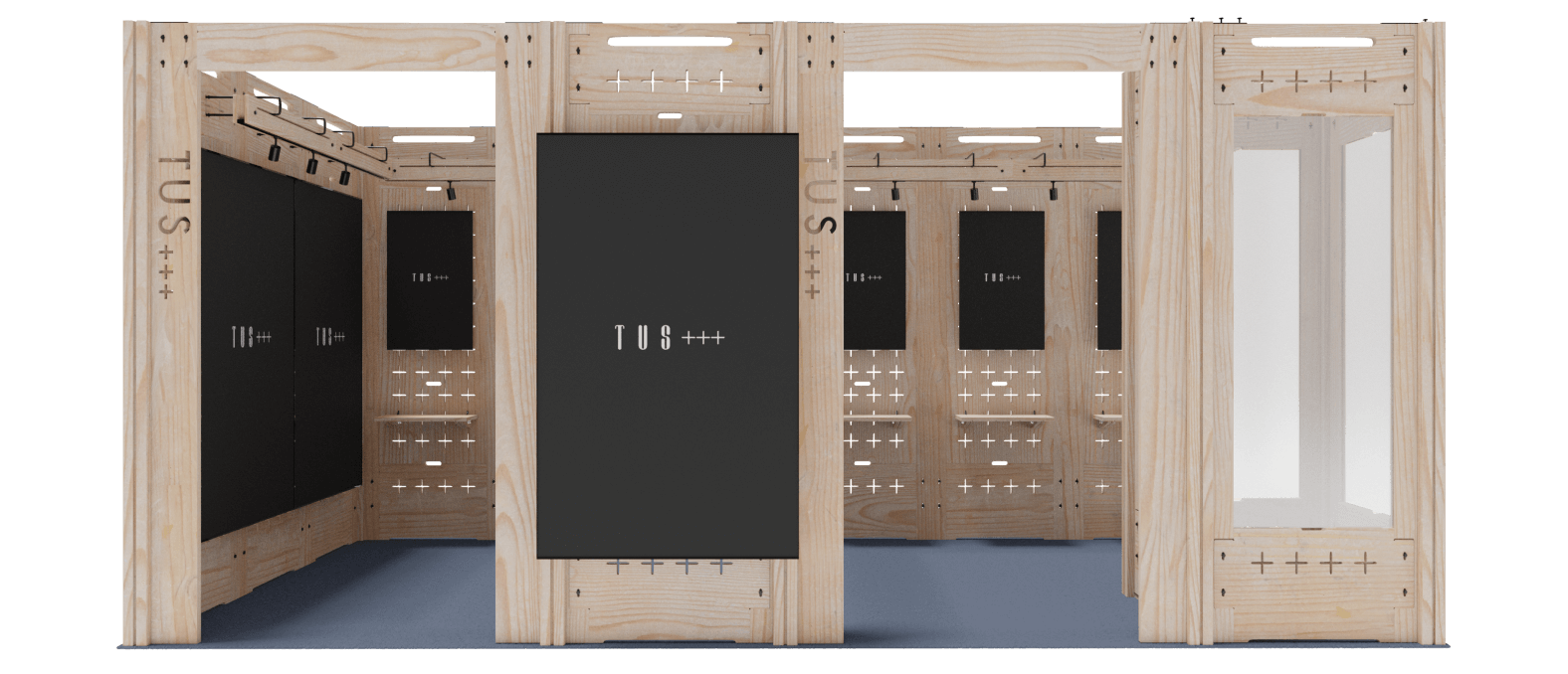 『TUS+++』は、企業展示会の出展コスト、出展時に発生するゴミの削減を目的に開発した、自由なアレンジで繰り返し使える組立式の木製ブースです。『TUS+++』を通して、企業展示会で発生する大量のゴミ問題を解決し、SDGs+カーボンニュートラルを実現します。