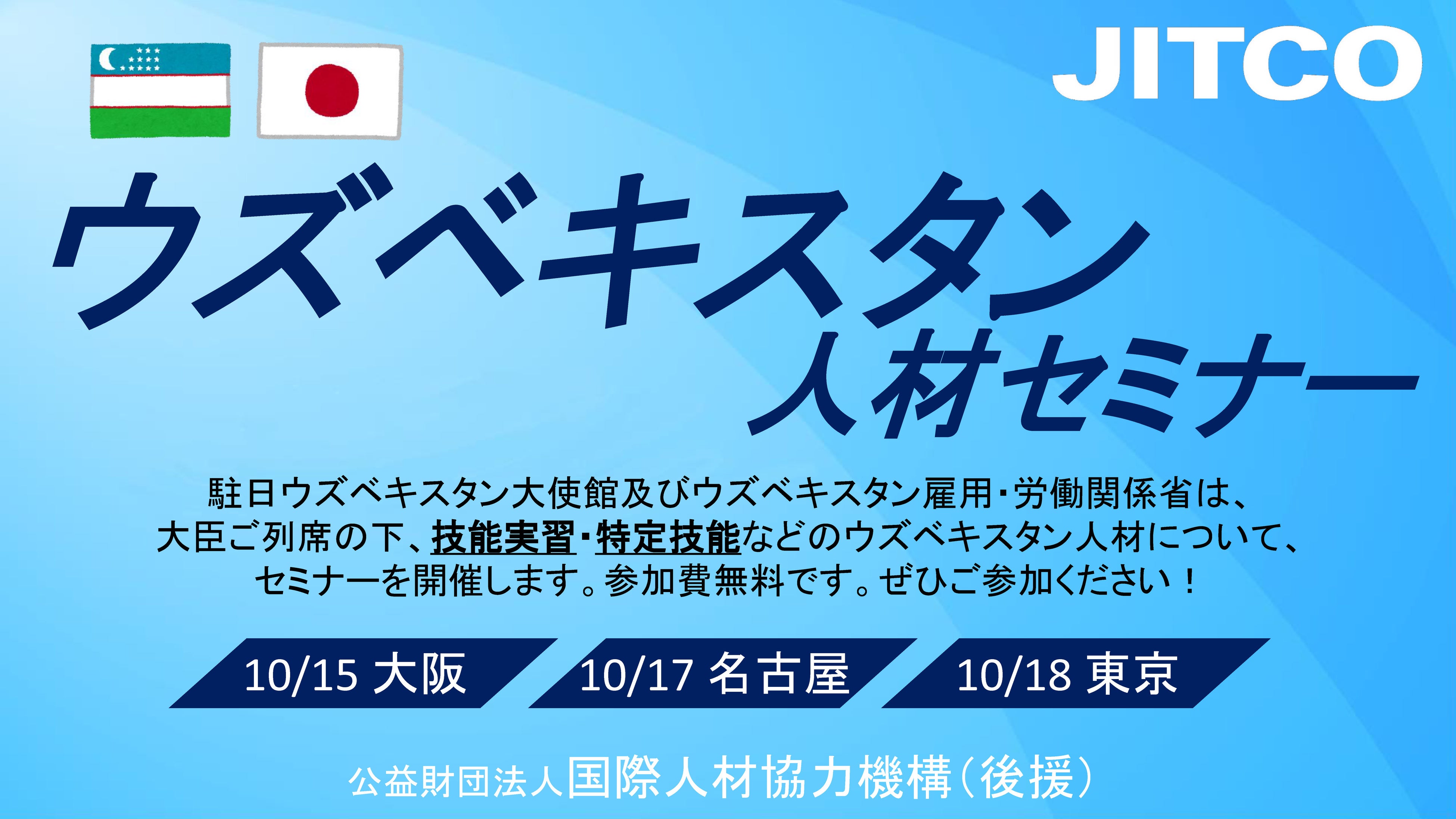 公益財団法⼈国際⼈材協⼒機構(JITCO/ジツコ、所在地:東京都港区、理事⻑:⼋⽊ 宏幸)は、駐日ウズベキスタン大使館及びウズベキスタン雇用・労働関係省が10月に大阪・名古屋・東京で開催するウズベキスタン人材セミナーを後援いたします。ウズベキスタンからの技能実習生や特定技能外国人の採用にご関心のある方は、ぜひご参加ください!