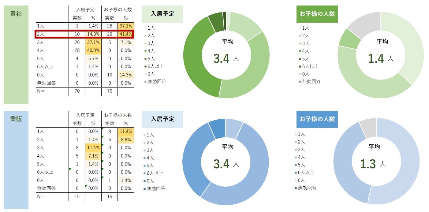 新居に入居する予定の人数は平均3.4人、お子様の人数は平均1.4人となった。DINKSの割合は12.9%、82.3%がお子様のいるファミリー層であり、お子様2人の比率が前回調査よりも増加(前回36.7%)。