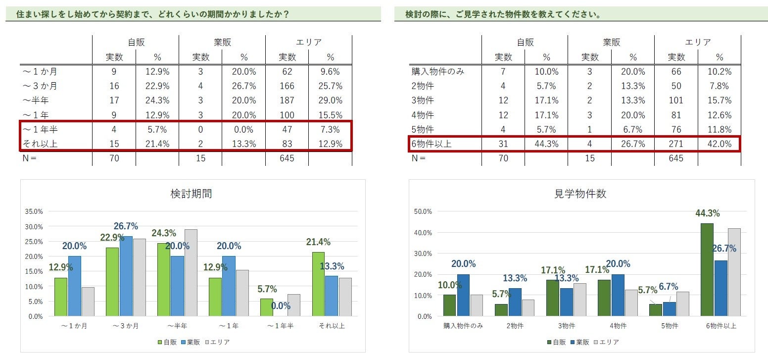 住まい探しを始めてから契約までの期間は、「1年以上」の長期検討者が最も多い。また、購入までに見学した物件の数は、6件以上の割合が41.2%となった。戸建住宅の価格が上がり続けている影響もあるのか、慎重にこだわりをもって検討している顧客が多い。資材価格の高騰や需要の増加で今後も下がる見通しが立たないため、ライフステージを重視して購入時期を決めることをおすすめしたい。