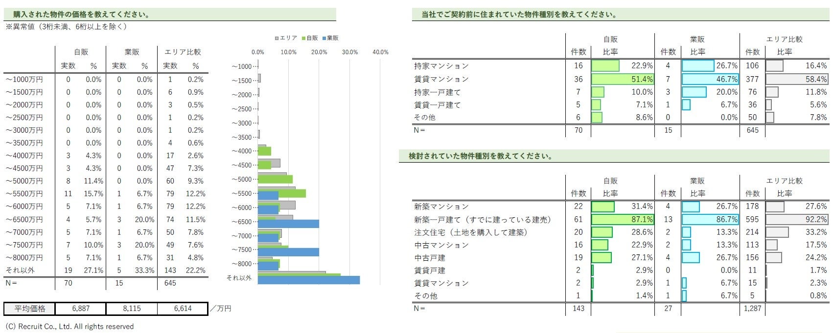 購入物件の価格帯8,000万円以上が28%と前回よりも16.9pt上昇。賃貸物件からの一次取得層が57.6%と前回より5.7pt下がり、持ち家比率は35.3%と前回より8.6pt増加した。検討物件の種別は建売検討者が87.1%と圧倒的に多いが、前回よりも新築マンション検討が増加した。(前回24.4%⇒30.6%)