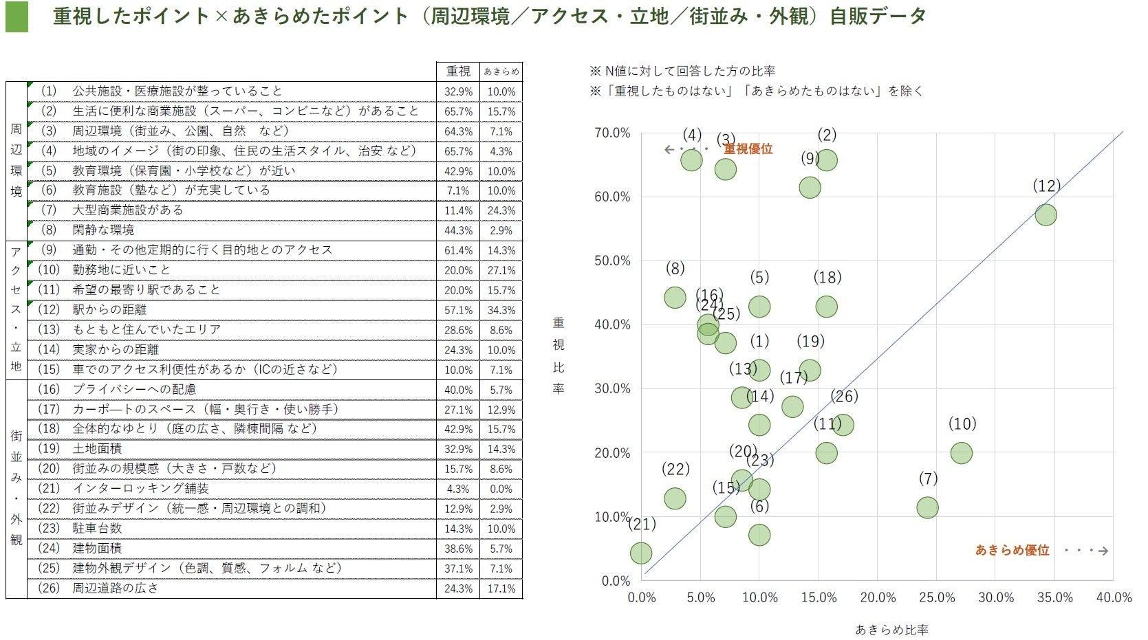 購入に際しては、「生活に便利な商業施設(スーパー、コンビニなど)があること」および「地域のイメージ(街並み)、公園、自然など」が重視されたいっぽうで「駅からの距離」や「勤務地に近いこと」があきらめポイントの上位で、通勤に関わる項目があきらめられる傾向がみられた。