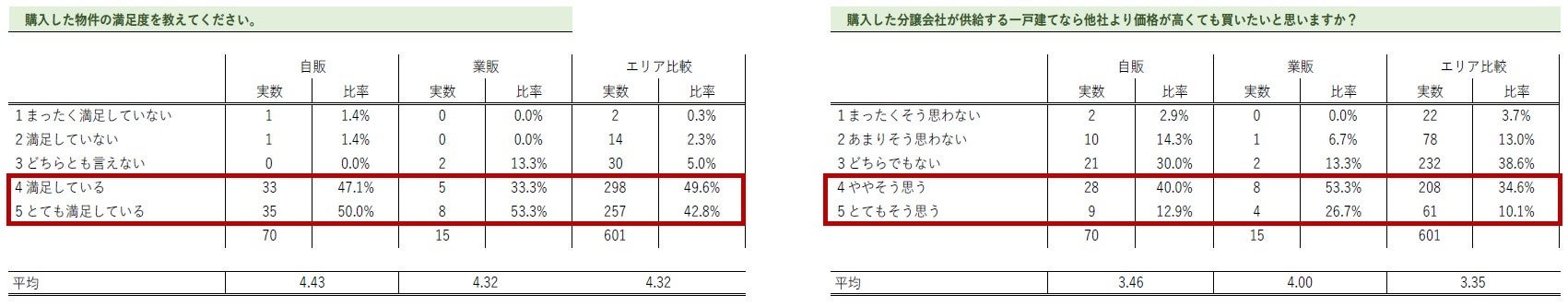 物件満足度で「4満足している」以上の回答比率は95.3%と圧倒的に多い。他社よりも高くても買いたいという割合も半数以上となっていることから、当社物件の省エネルギーや防犯システムといった「建物性能」や、標準装備をしている「住宅設備」が評価いただけているという結果となった。