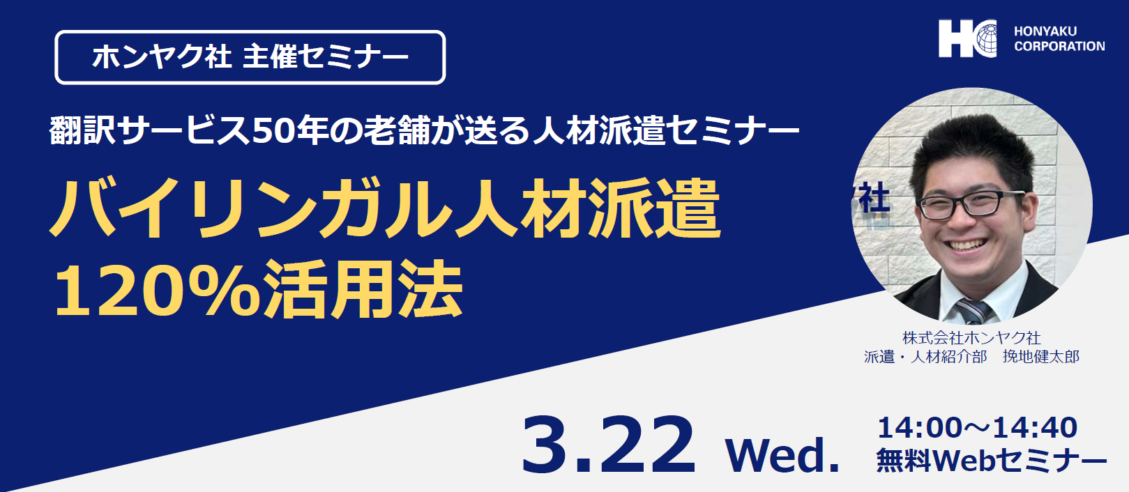 産業分野に特化した翻訳サービスのみならず、語学に特化した人材派遣サービスを展開する株式会社ホンヤク社(代表取締役:原田真)は、翻訳サービス50年の老舗が送る人材派遣セミナー『バイリンガル派遣120%活用法』と題したWebセミナーを2023年3月22日(水)に開催します。