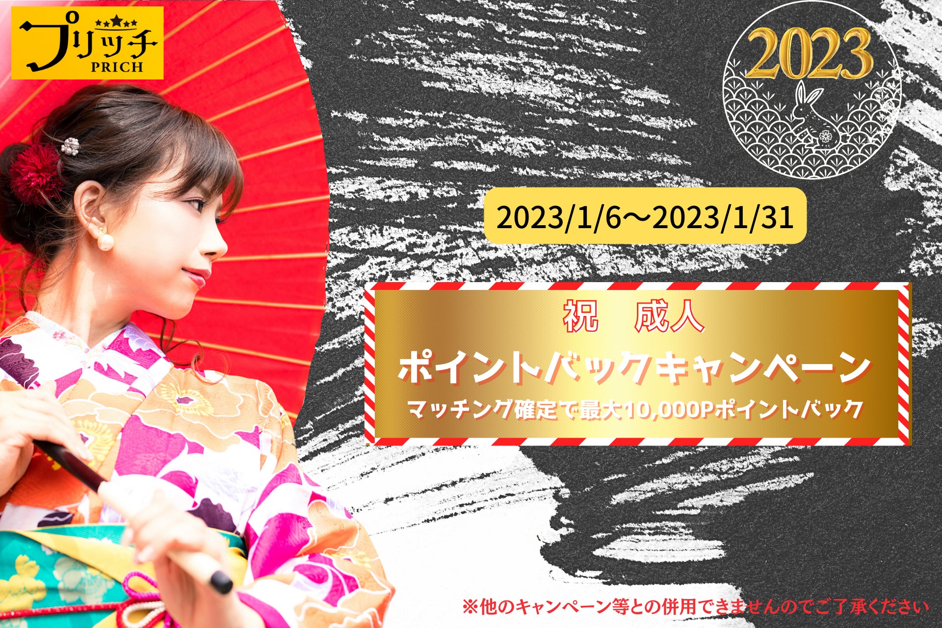 アプリをご利用いただき、新成人である18歳~20歳のキャストまたはゲストが成約すると、1回目と2回目にそれぞれ5,000ポイントで最大10,000円ポイントを還元いたします。法律上は新成人となっても、地域によっては成人式に参加できない18歳と19歳をプリッチで応援しませんか?