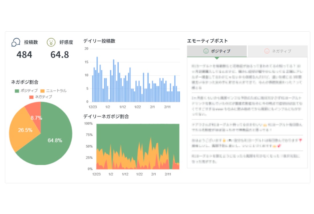 こちらも、検索ワード・商材名・カテゴリを入力するだけで、SNS投稿データを自動収集。ポジティブ・ネガティブ分析に加え、感情的な投稿(エモーティブポスト)を抽出し、商材に対する「好まれている点」と「課題点」を整理します。